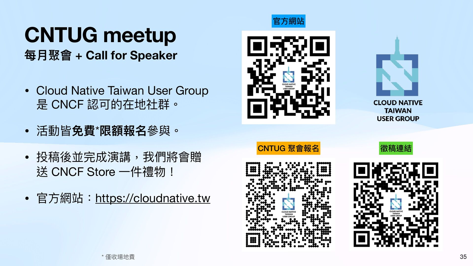 35 • Cloud Native Taiwan User Group 是 CNCF 認可的在地社群。