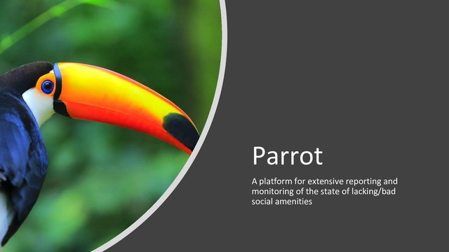 A pitch at the Code Naija on our solution Parrot which is focused on aggregating reports on lacking amenities and providing a base platform for contractors to look up places for action.