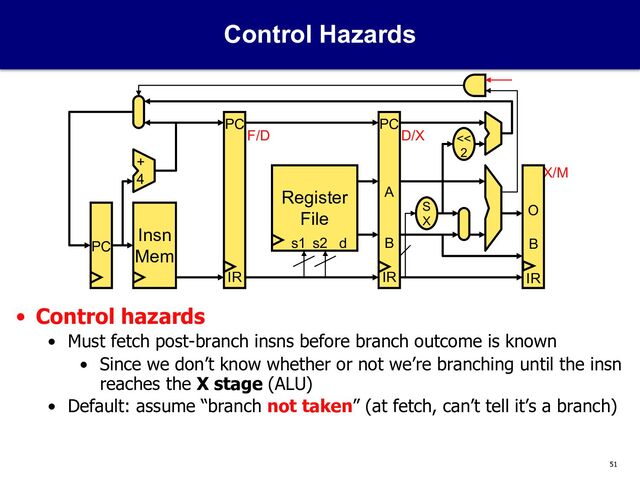 instead of X • Duplicate comparison logic only, not the whole ALU + New taken branch penalty is now 1 stall instead of 2 – Additional insns (slt) for more complex tests, must bypass to D too • 25% of branches have complex tests that require extra insn • CPI = 1 + 0.20*0.75*1(branch) + 0.20*0.25*1(extra insn) = 1.2 PC Insn Mem Register File s1 s2 d + 4 << 2 F/D D/X X/M S X <> 0 O B IR A B IR PC IR S X