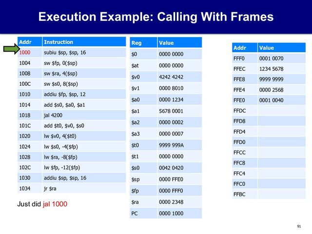 0000 $at ???? ???? $v0 8675 3090 $v1 ???? ???? $a0 ???? ???? $a1 ???? ???? $a2 ???? ???? $a3 ???? ???? $t0 ???? ???? $t1 ???? ???? $s0 5678 1235 $sp 0000 FFD0 $fp 0000 FFDC $ra 0000 101C PC 0000 101C Addr Instruction 1000 subiu $sp, $sp, 16 1004 sw $fp, 0($sp) 1008 sw $ra, 4($sp) 100C sw $s0, 8($sp) 1010 addiu $fp, $sp, 12 1014 add $s0, $a0, $a1 1018 jal 4200 101C add $t0, $v0, $s0 1020 lw $v0, 4($t0) 1024 lw $s0, -4($fp) 1028 lw $ra, -8($fp) 102C lw $fp, -12($fp) 1030 addiu $sp, $sp, 16 1034 jr $ra Addr Value FFF0 0001 0070 FFEC 1234 5678 FFE8 9999 9999 FFE4 0000 2568 FFE0 0001 0040 FFDC FFD8 0042 0420 FFD4 0000 2348 FFD0 0000 FFF0 FFCC FFC8 FFC4 FFC0 FFBC But before it returns, it is responsible for restoring certain registers Including $sp and $fp, and $s0 Value returned in $v0