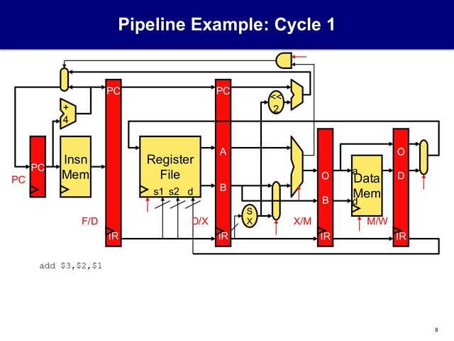 S X s1 s2 d Data Mem + 4 << 2 PC IR PC A B IR O B IR O D IR PC F/D D/X X/M M/W sw $6,4($7) lw $4,0($5) add $3,$2,$1 Register File S X << 2 Data Mem a d