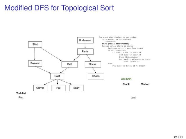 For each startvertex in verticies: if startvertex in visited continue Push (visit,startvertex) Repeat until stack is empty (action,curr) = pop from stack if action==visit if curr is not in visited add curr to visited Push (finish,curr) for each v adjacent to curr push (visit,v) else Put curr on front of todolist Stack is empty, so outer loop goes to next vertex If we pick Belt (already visited), we just go to the next vertex 38 / 71