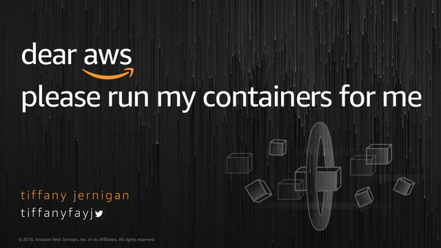 rights reserved. T I F F A N Y F A Y J FOCUS FOR THIS TALK MANAGEMENT Deployment, Scheduling, Scaling & Management of containerized applications HOSTING Where the containers run Amazon Elastic Container Service AWS Fargate