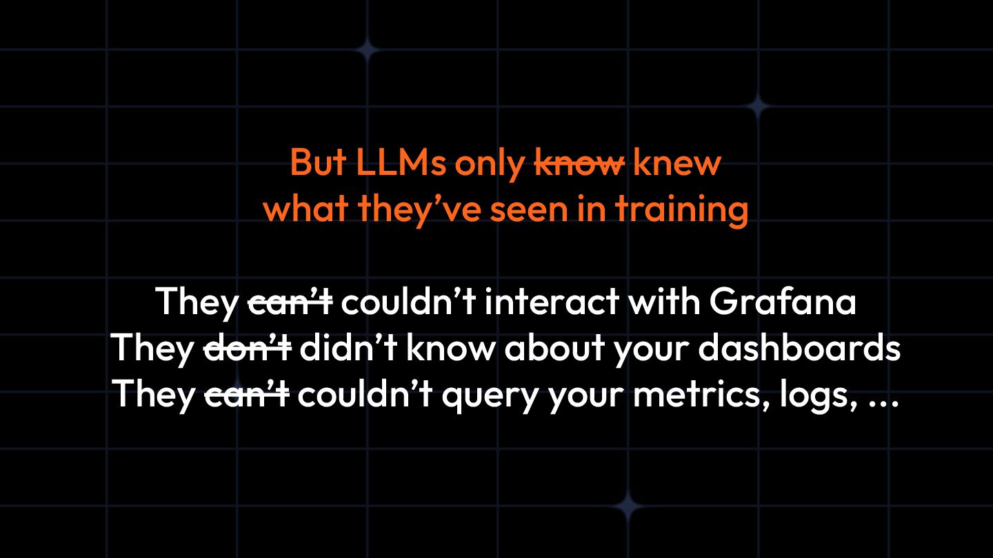 They can’t couldn’t interact with Grafana They don’t didn’t know about your dashboards They can’t couldn’t query your metrics, logs, ...