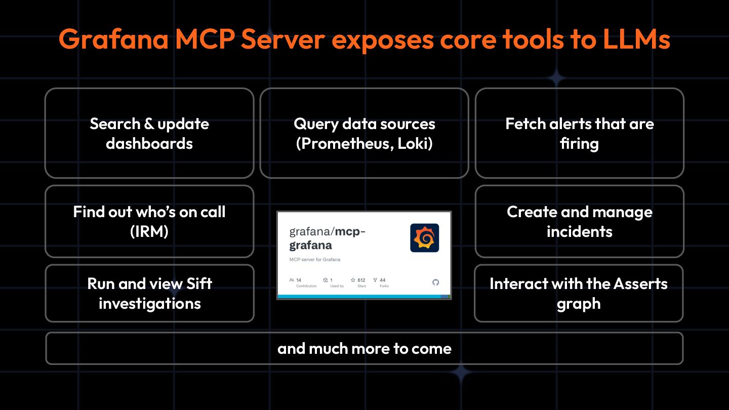Find out who’s on call (IRM) Search & update dashboards Create and manage incidents Run and view Sift investigations Interact with the Asserts graph and much more to come Grafana MCP Server exposes core tools to LLMs