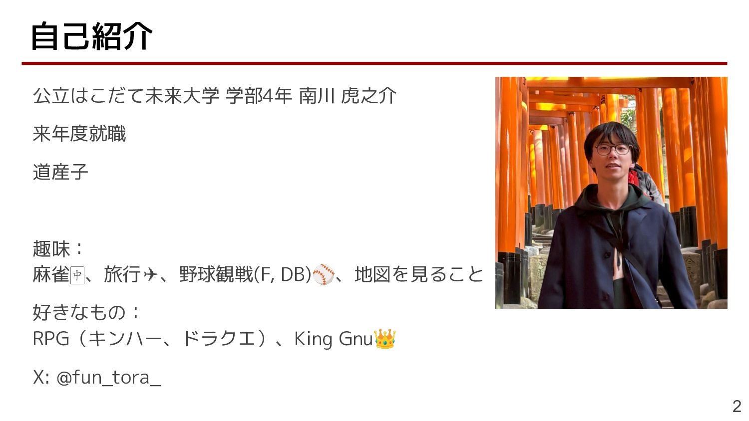公立はこだて未来大学 学部4年 南川 虎之介 来年度就職 道産子 趣味: 麻雀🀄、旅行✈、野球観戦(F, DB)⚾、地図を見ること 好きなもの: