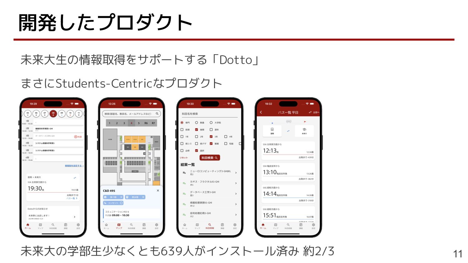未来大生の情報取得をサポートする「Dotto」 まさにStudents-Centricなプロダクト 未来大の学部生少なくとも639人がインストール済み 約2/3 開発したプロダクト 11