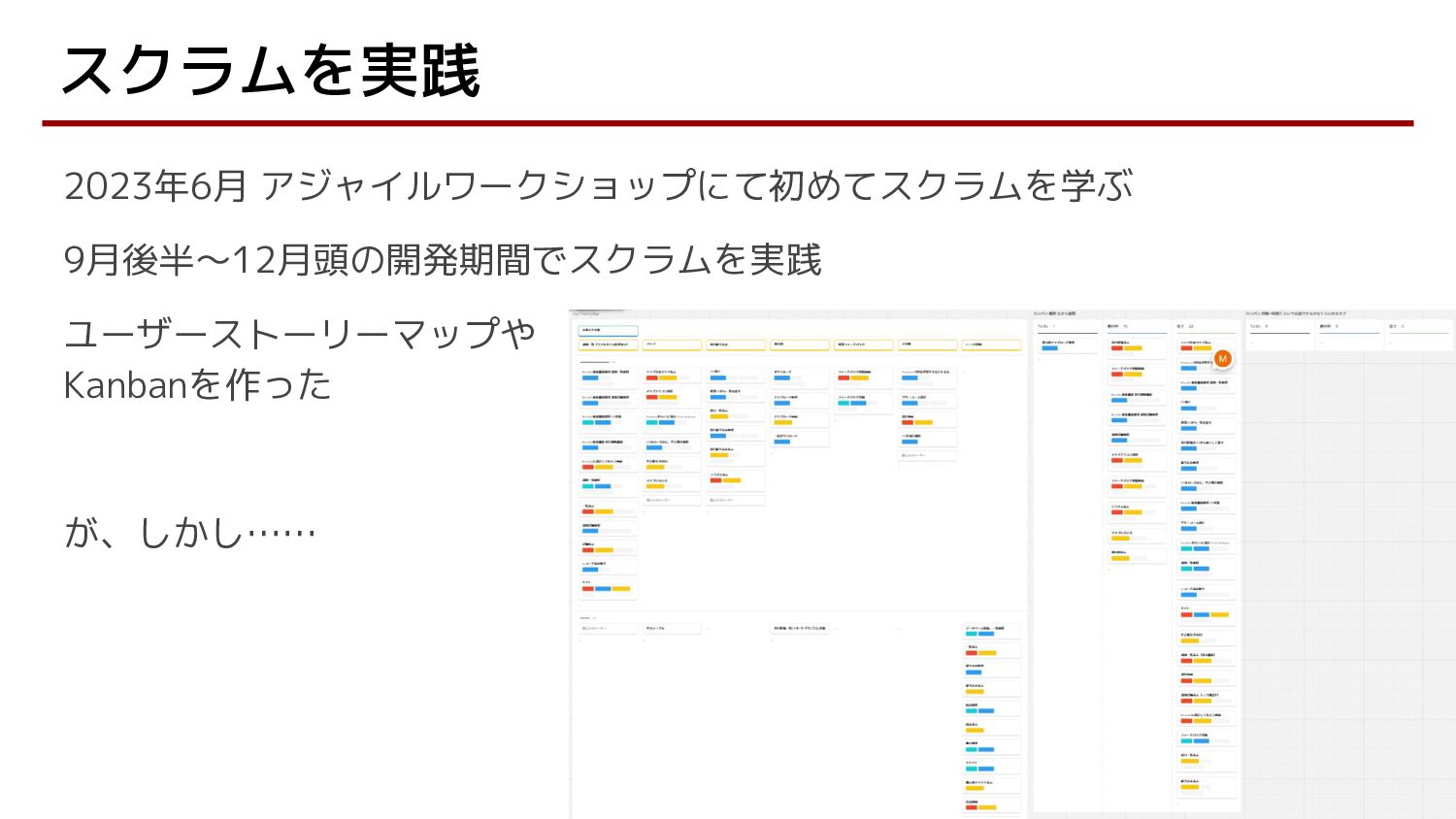 2023年6月 アジャイルワークショップにて初めてスクラムを学ぶ 9月後半~12月頭の開発期間でスクラムを実践 ユーザーストーリーマップや Kanbanを作った が、しかし…… スクラムを実践 13