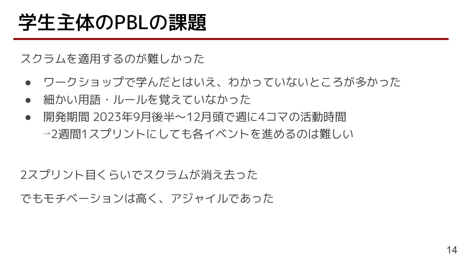 でもモチベーションは高く、アジャイルであった 学生主体のPBLの課題 14