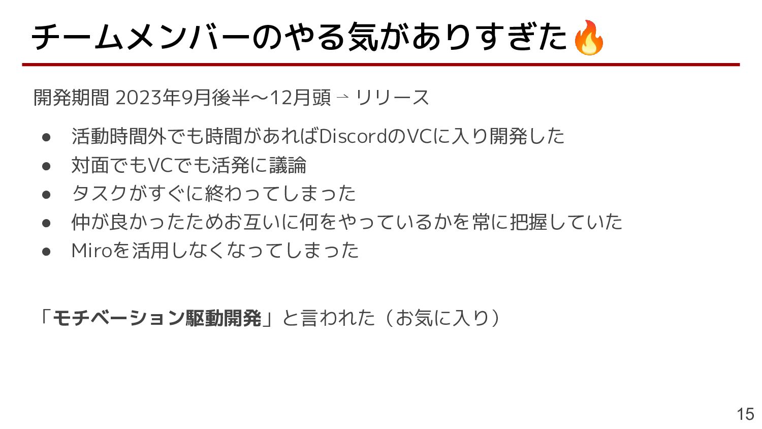 • 仲が良かったためお互いに何をやっているかを常に把握していた • Miroを活用しなくなってしまった 「モチベーション駆動開発」と言われた(お気に入り) チームメンバーのやる気がありすぎた🔥 15