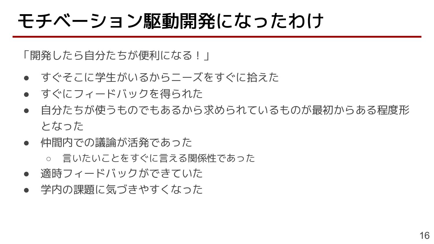 ◦ 言いたいことをすぐに言える関係性であった • 適時フィードバックができていた • 学内の課題に気づきやすくなった モチベーション駆動開発になったわけ 16