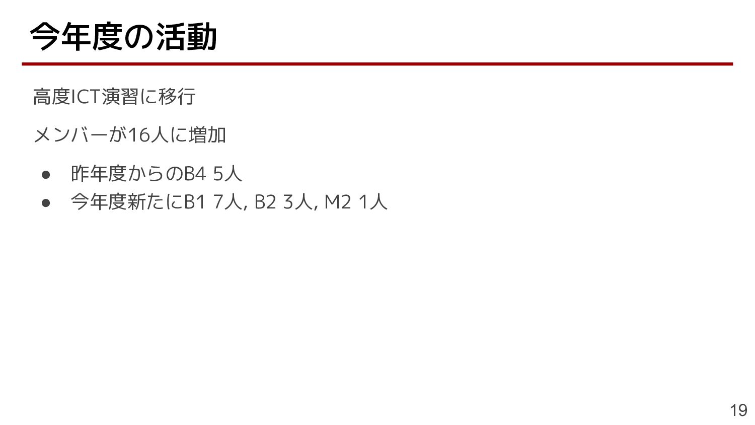 高度ICT演習に移行 メンバーが16人に増加 • 昨年度からのB4 5人 • 今年度新たにB1 7人, B2 3人,