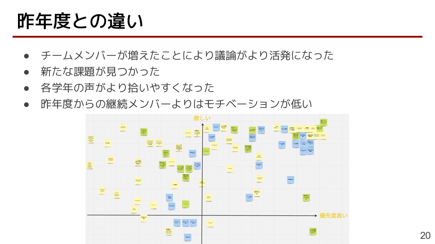 • チームメンバーが増えたことにより議論がより活発になった • 新たな課題が見つかった • 各学年の声がより拾いやすくなった • 昨年度からの継続メンバーよりはモチベーションが低い 昨年度との違い 20