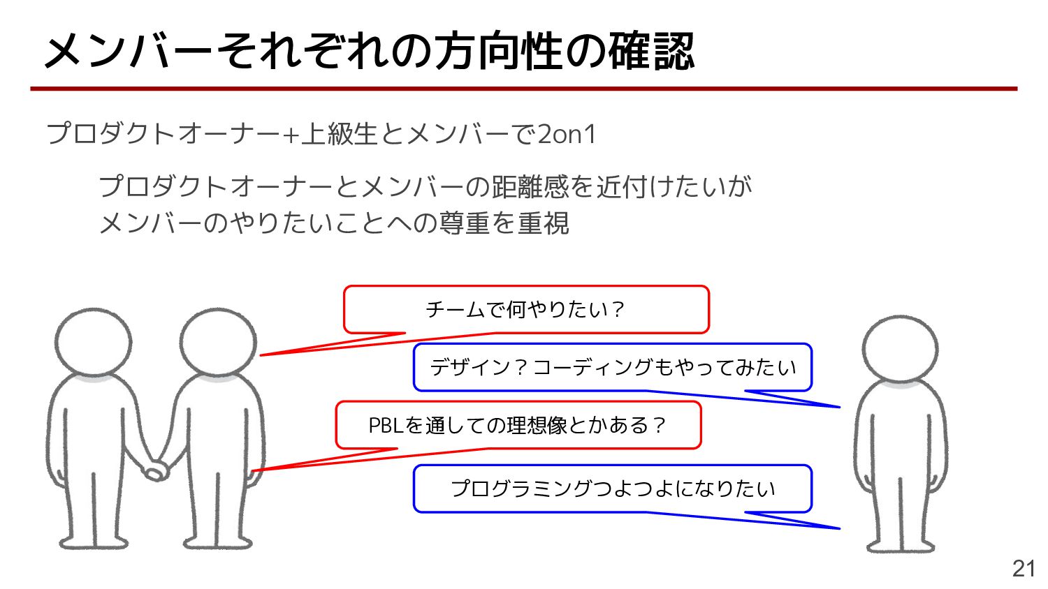 プロダクトオーナー+上級生とメンバーで2on1 プロダクトオーナーとメンバーの距離感を近付けたいが メンバーのやりたいことへの尊重を重視 メンバーそれぞれの方向性の確認 21 チームで何やりたい? デザイン?コーディングもやってみたい PBLを通しての理想像とかある? プログラミングつよつよになりたい