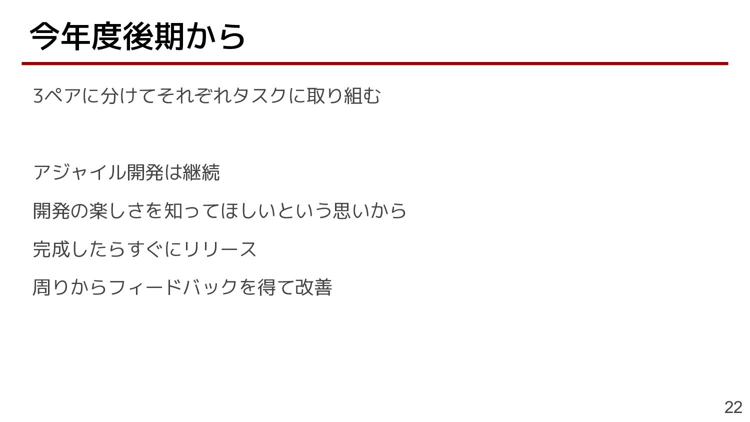 3ペアに分けてそれぞれタスクに取り組む アジャイル開発は継続 開発の楽しさを知ってほしいという思いから 完成したらすぐにリリース 周りからフィードバックを得て改善 今年度後期から 22