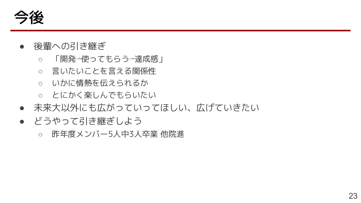 • 未来大以外にも広がっていってほしい、広げていきたい • どうやって引き継ぎしよう ◦ 昨年度メンバー5人中3人卒業 他院進 今後 23