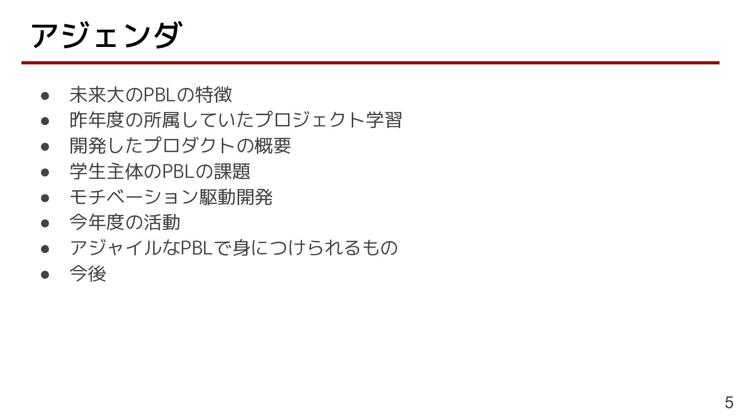 • 未来大のPBLの特徴 • 昨年度の所属していたプロジェクト学習 • 開発したプロダクトの概要 • 学生主体のPBLの課題 • モチベーション駆動開発