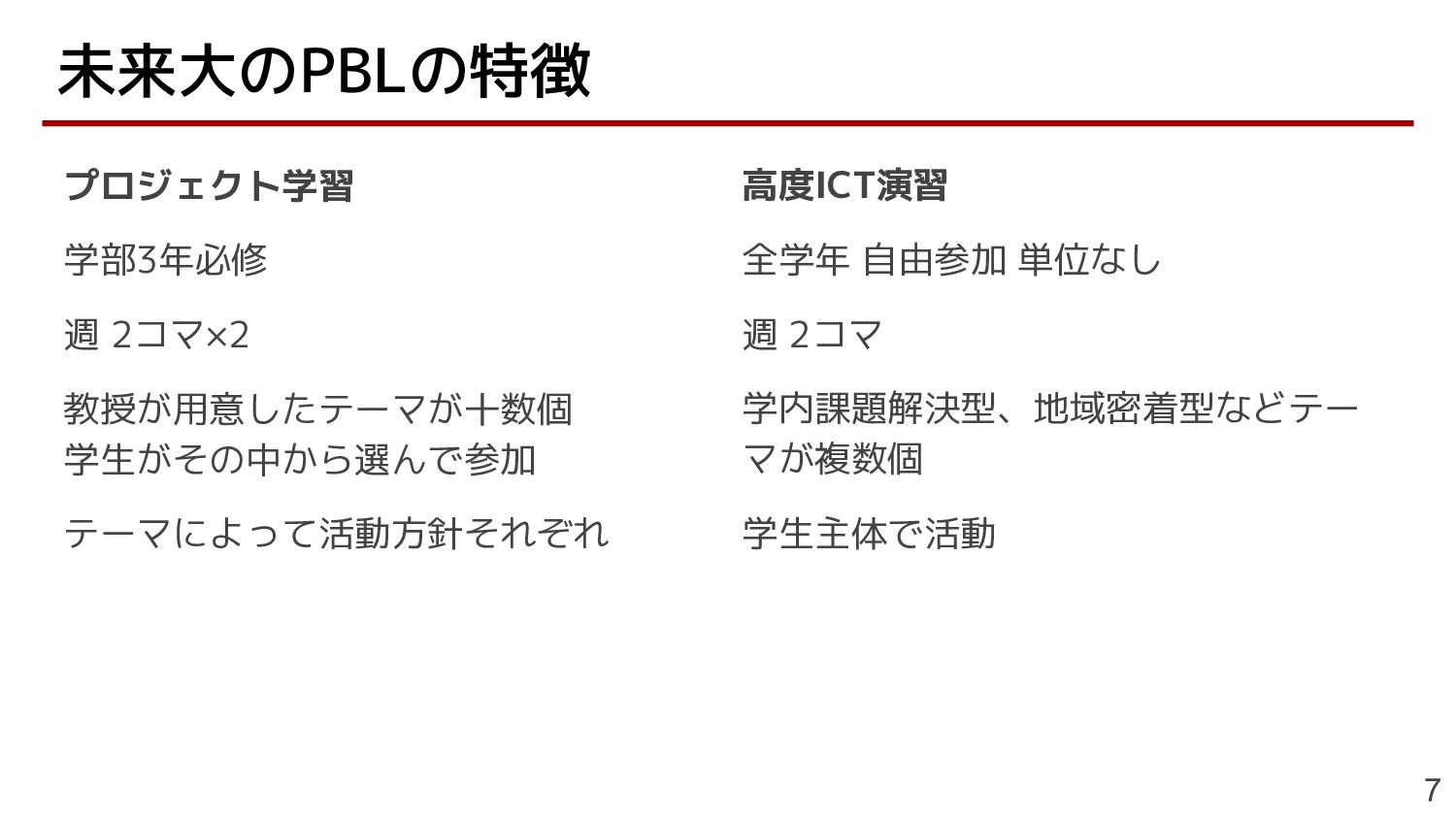 プロジェクト学習 学部3年必修 週 2コマ×2 教授が用意したテーマが十数個 学生がその中から選んで参加 テーマによって活動方針それぞれ 未来大のPBLの特徴 7 高度ICT演習