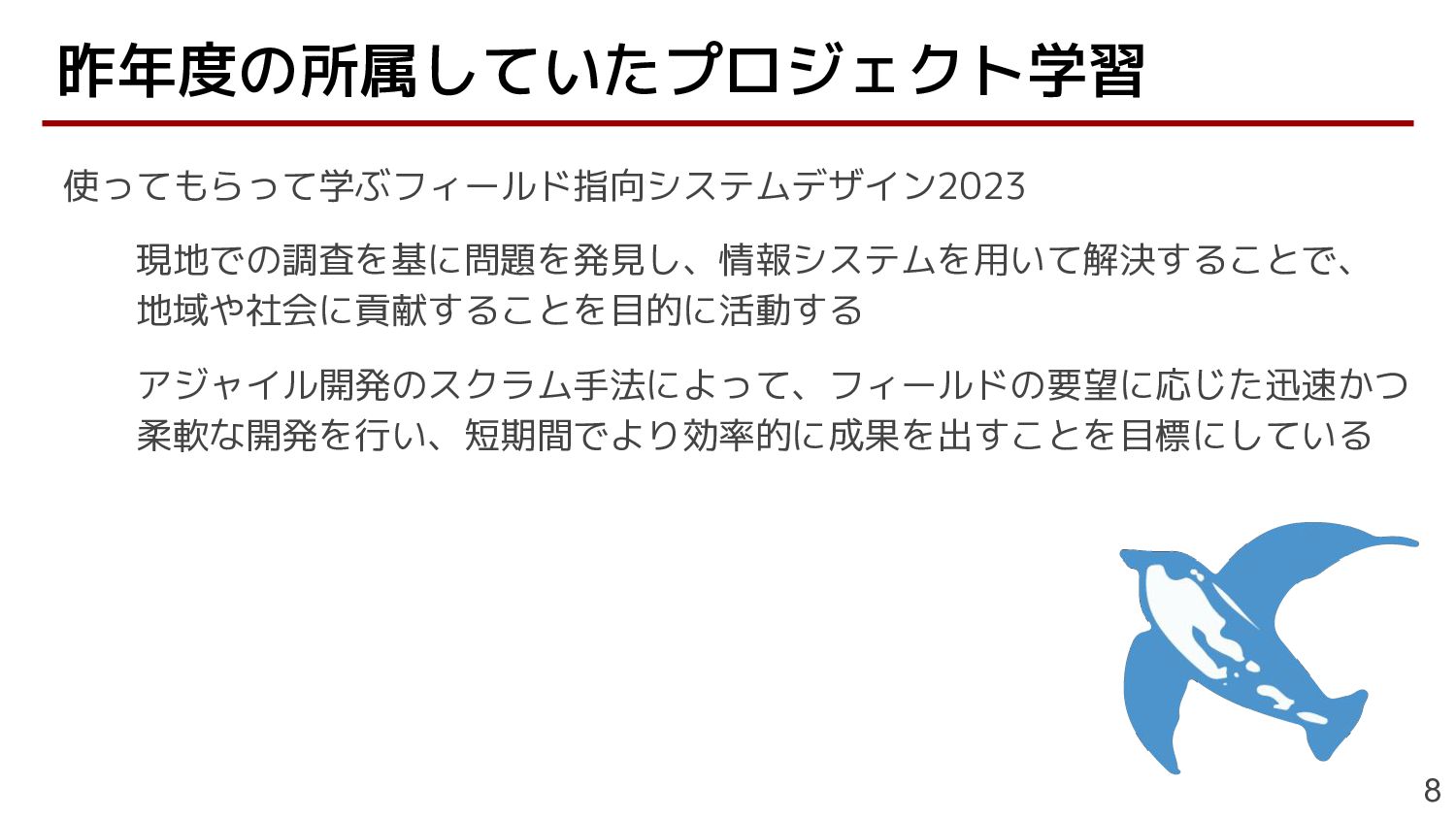 使ってもらって学ぶフィールド指向システムデザイン2023 現地での調査を基に問題を発見し、情報システムを用いて解決することで、 地域や社会に貢献することを目的に活動する アジャイル開発のスクラム手法によって、フィールドの要望に応じた迅速かつ 柔軟な開発を行い、短期間でより効率的に成果を出すことを目標にしている 昨年度の所属していたプロジェクト学習 8