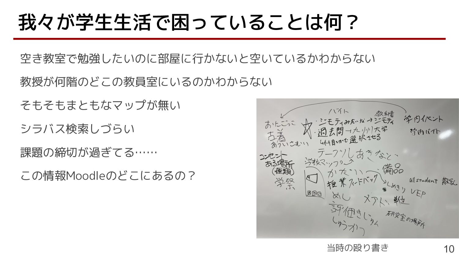 空き教室で勉強したいのに部屋に行かないと空いているかわからない 教授が何階のどこの教員室にいるのかわからない そもそもまともなマップが無い シラバス検索しづらい 課題の締切が過ぎてる…… この情報Moodleのどこにあるの? 我々が学生生活で困っていることは何? 10 当時の殴り書き