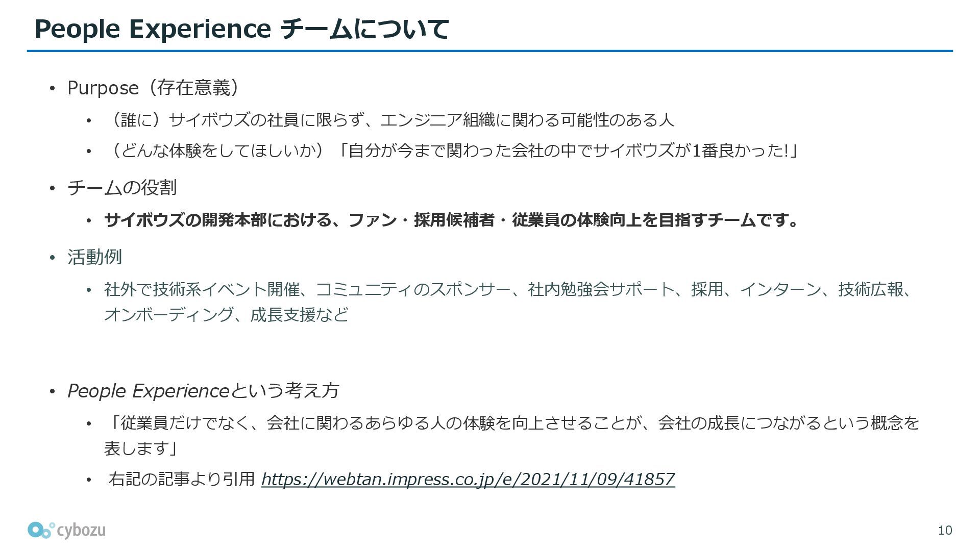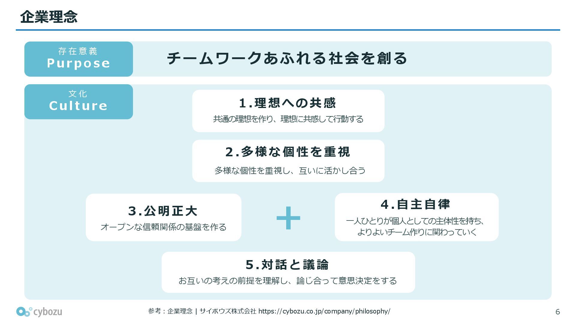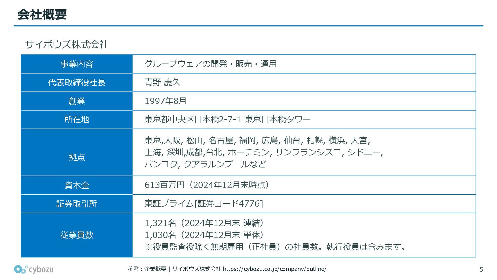 東京都中央区日本橋2-7-1 東京日本橋タワー 拠点 東京,大阪, 松山, 名古屋, 福岡, 広島, 仙台, 札幌, 横浜, 大宮, 上海, 深圳,成都,台北, ホーチミン, サンフランシスコ, シドニー, バンコク, クアラルンプールなど 資本金 613百万円(2024年12月末時点) 証券取引所 東証プライム[証券コード4776] 従業員数 1,321名(2024年12月末 連結) 1,030名(2024年12月末 単体) ※役員監査役除く無期雇用(正社員)の社員数。執行役員は含みます。 5 参考:企業概要 | サイボウズ株式会社 https://cybozu.co.jp/company/outline/