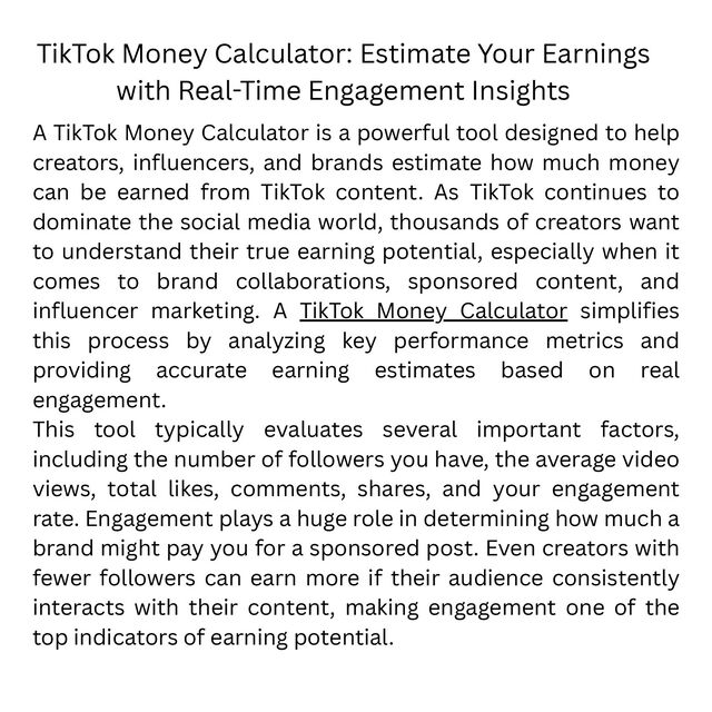 The TikTok Money Calculator is a smart tool for creators, influencers, and brands to estimate potential earnings from TikTok content. By analyzing metrics like followers, video views, likes, comments, shares, and engagement rate, it provides an accurate estimate of income from sponsored posts and brand deals. Even small creators can see their worth, as engagement often matters more than follower count. Brands can also use it to determine fair payments for collaborations. This tool helps influencers plan content strategies, track growth, and maximize revenue, making TikTok monetization transparent and easier to manage.