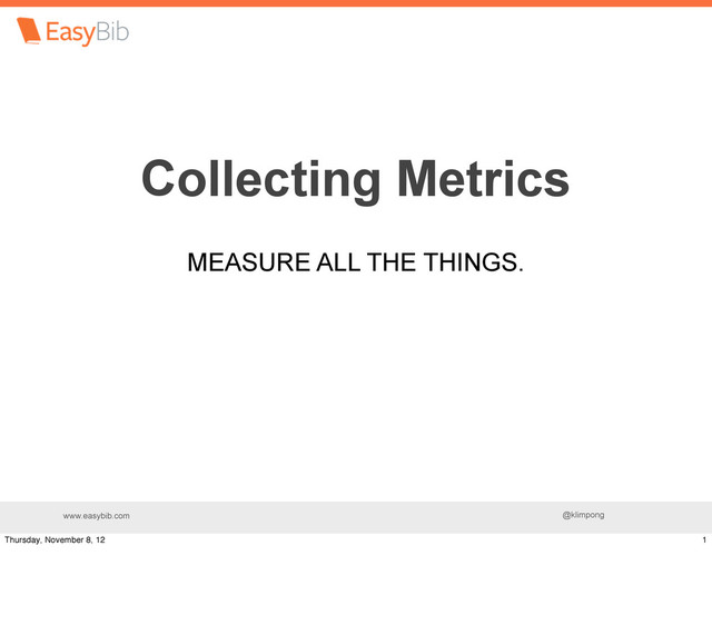 is Node.js. StatsD uses UDP. It’s asynchronous and painless. Backends are pluggable. /statsd 8 Thursday, November 8, 12 Etsy’s work was inspired by Flickr. standard backends: graphite, console, reapeter available backends: librato, cloudwatch, mongodb, ...