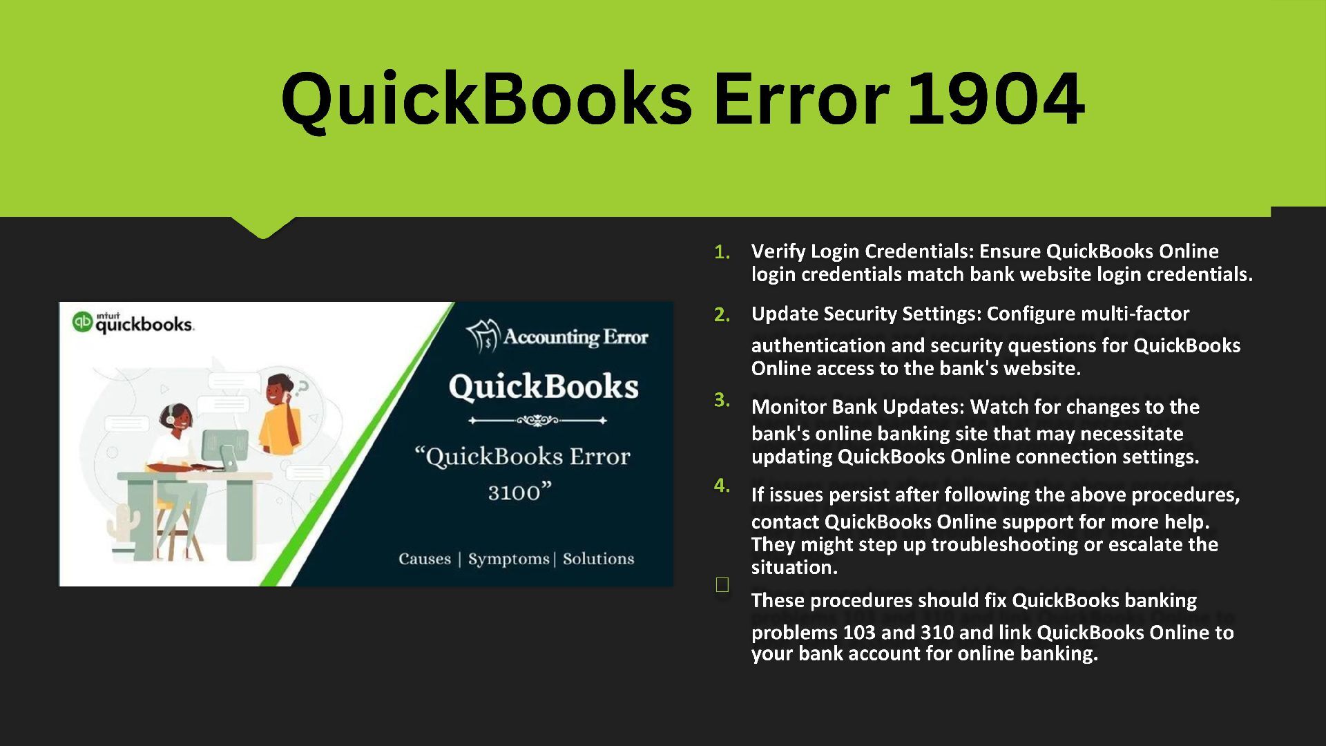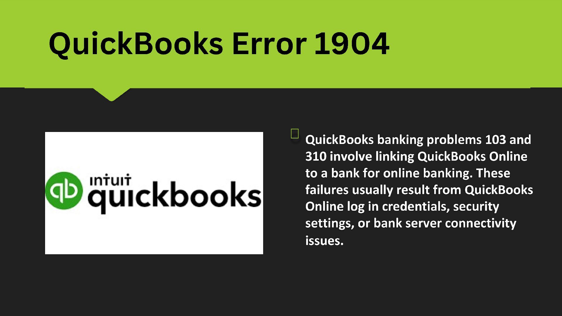 QuickBooks Error 1904occurs when the login credentials (username or password) you’ve entered for your bank are incorrect or not recognized by the bank’s website. QuickBooks