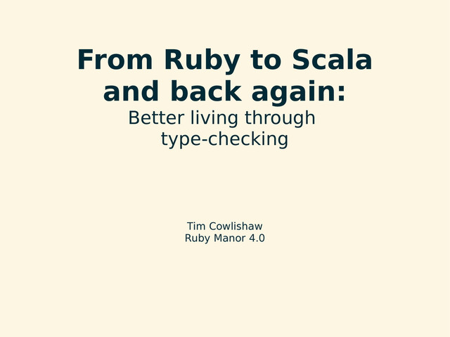 Ruby • Increasingly using Scala whenever I can • Why? – Ruby-like syntax and lack of ceremony – On the JVM – Best bits of Functional and OO paradigms – Powerful statically checked type system