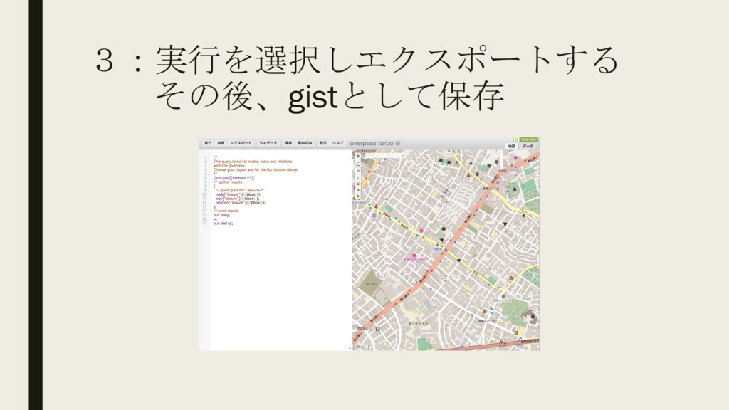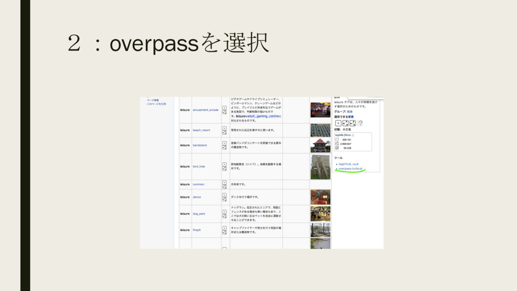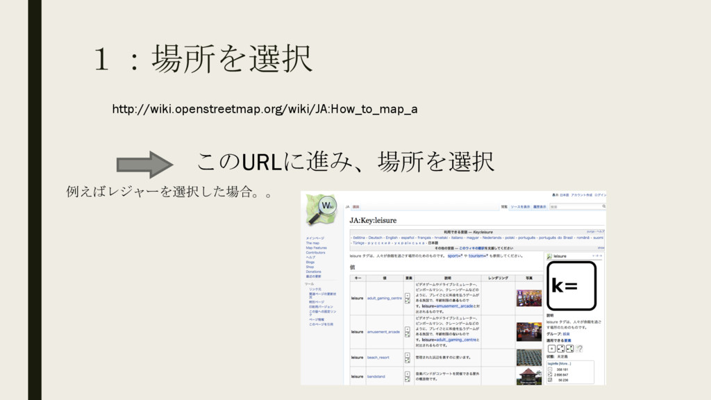 1:場所を選択 http://wiki.openstreetmap.org/wiki/JA:How_to_map_a このURLに進み、場所を選択 例えばレジャーを選択した場合。。