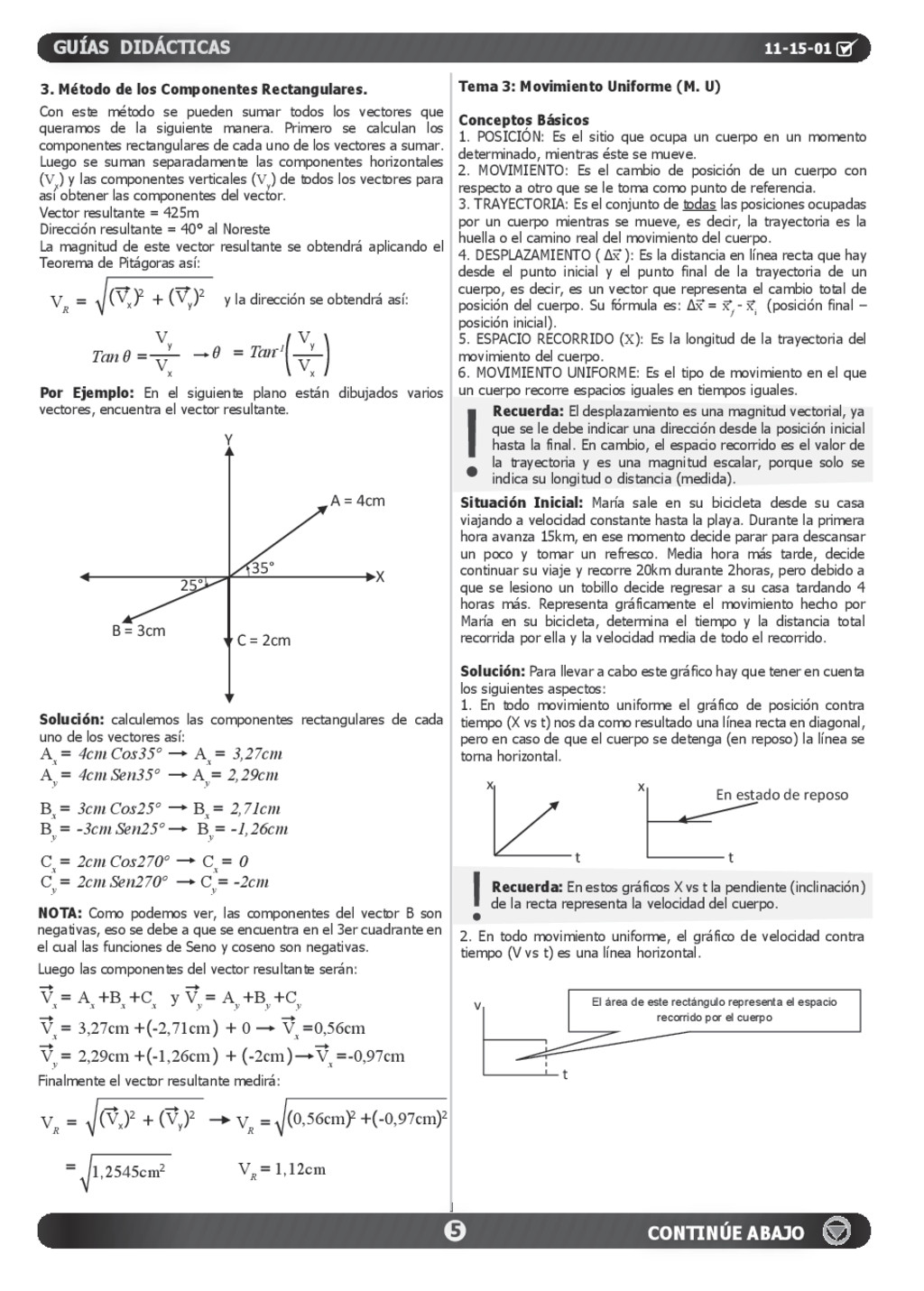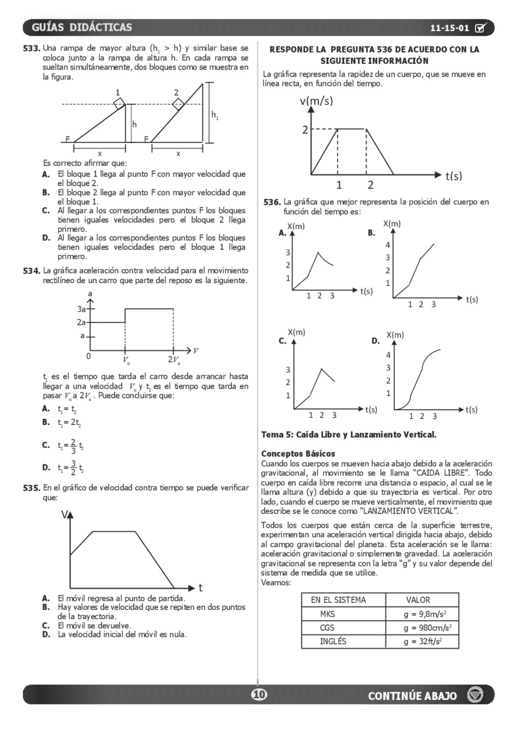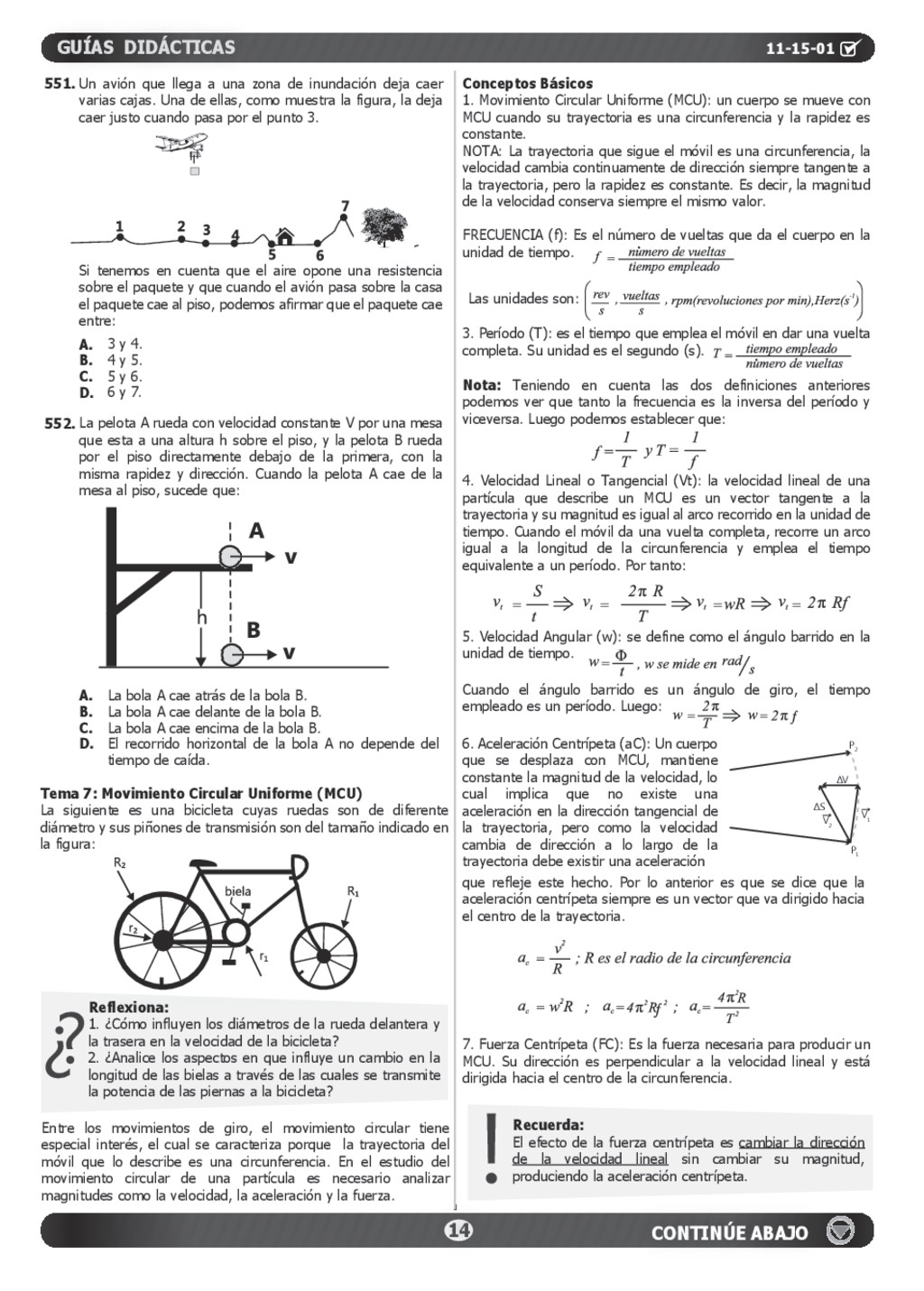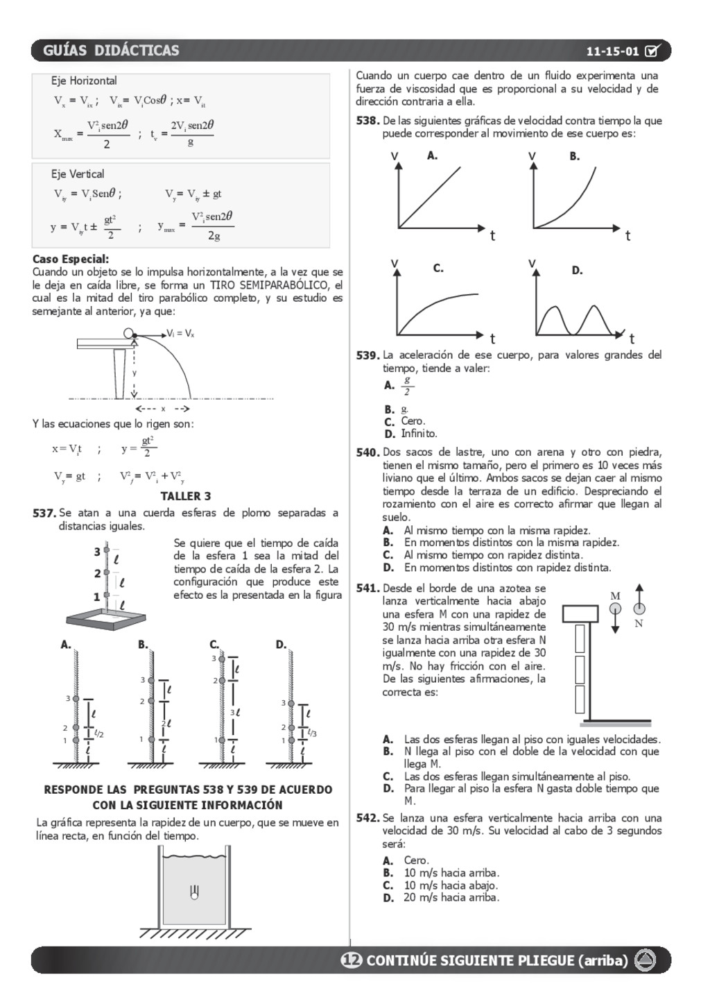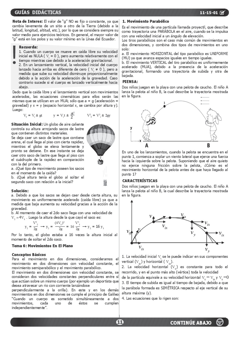 de “g” NO es fijo o constante, ya que cambia levemente de un sitio a otro de la Tierra (debido a la latitud, longitud, altitud, etc.), por lo que se considera siempre su valor medio para ejercicios teóricos. En general, el mayor valor de “g” está en los polos y su valor mínimo en la Línea del Ecuador. Dado que la caída libre y el lanzamiento vertical son movimientos acelerados, las ecuaciones cinemáticas para ellos serán las mismas que se utilizan en un MUA; sólo que a = g (aceleración = gravedad) y x = y (espacio horizontal x, se cambia por altura y). Luego: Recuerda: 1. Cuando un cuerpo se mueve en caída libre su velocidad inicial es NULA ( V i = 0 ), pero aumenta relativamente con el tiempo mientras cae debido a la aceleración gravitacional. 2. En un lanzamiento vertical, la velocidad inicial del cuerpo lanzado hacia arriba es diferente de cero ( V i ≠ 0 ), pero a medida que sube su velocidad disminuye proporcionalmente debido a la acción de la aceleración de la gravedad. Caso contrario sucede si el cuerpo es lanzado verticalmente hacia abajo. V f = V i ± gt V2 f = V2 i ± 2gy y = V i t ± at2 2 Situación Inicial: Un globo de aire caliente controla su altura arrojando sacos de lastre que contienen distintos materiales. Se deja caer un saco de lastre que contiene arena, el cual llega al piso con cierta rapidez, mientras el globo se eleva lentamente y pronto se detiene. En ese instante se deja caer otro saco de lastre que llega al piso con el cuádruple de la rapidez en comparación con la del primero. a. ¿Qué tipo de movimiento poseen los sacos en el momento de la caída? b. ¿Qué altura tenía el globo al soltar el segundo saco con relación a la inicial? Solución: a. Debido a que los sacos se dejan caer desde cierta altura, su movimiento es uniformemente acelerado (caída libre) ya que a medida que baja aumenta su velocidad gracias a la acción de la gravedad. b. Al momento de caer el 2do saco llega con una velocidad de V 2 = 4V 1 . Luego la altura desde la que cayó el saco es: Por lo tanto, el globo estaba a 16 veces la altura inicial al momento de soltar el 2do saco. y 2 = y 2 = 16 y 1 y 2 = 16 = 2g V2 2 2g V2 1 2g (4V 1 )2 Tema 6: Movimientos En El Plano Conceptos Básicos Para el movimiento en dos dimensiones, consideramos el movimiento en dos dimensiones con velocidad constante, el movimiento semiparabólico y el movimiento parabólico. El movimiento en dos dimensiones con velocidad constante, se consideran dos velocidades constantes perpendiculares entre sí que actúan sobre un mismo cuerpo (por ejemplo un deportista que desea atravesar un rio con corriente lanzándose perpendicularmente a la orilla). En este y en los demás movimientos en dos dimensiones se cumple el principio de Galileo: “Cuando un cuerpo es sometido simultáneamente a dos movimientos, cada uno de éstos se cumplen independientemente”. Es el movimiento de una partícula llamada proyectil, que describe como trayectoria una PARÁBOLA en el aire, cuando se la impulsa con una velocidad inicial a un ángulo de elevación. Los tiros parabólicos son el caso más común de movimientos en dos dimensiones, y combina dos tipos de movimientos en uno solo: a. El movimiento HORIZONTAL del tipo parabólico es UNIFORME (MU) ya que avanza espacios iguales en tiempo iguales. b. El movimiento VERTICAL del tiro parabólico es uniformemente acelerado (MUA), debido a la presencia de la aceleración gravitacional, formando una trayectoria de subida y otra de bajada. Dos niños juegan en la playa con una pelota de caucho. El niño A lanza la pelota al niño B, la cual describe la trayectoria mostrada en la figura. En uno de los lanzamientos, cuando la pelota se encuentra en el punto 1, comienza a soplar un viento lateral que ejerce una fuerza hacia la izquierda sobre la pelota. Suponiendo que el aire quieto no ejerce ninguna fricción sobre la pelota, ¿Cómo es el movimiento horizontal de la pelota antes de que haya llegado al punto 1? 1. Movimiento Parabólico PIENSA: Dos niños juegan en la playa con una pelota de caucho. El niño A lanza la pelota al niño B, la cual describe la trayectoria mostrada en la figura. 1. La velocidad inicial V i se le puede indicar en sus componentes vertical (V iy ) y horizontal ( V ix ). 2. La velocidad horizontal (V x ) es constante para todo el recorrido, y en el punto más alto (vértice) toda la velocidad de la partícula equivale a su velocidad horizontal V x = V ix y V x =0 3. El tiempo de subida es igual al tiempo de bajada, debido a que la parábola formada es SIMÉTRICA respecto al eje vertical de su altura máxima (y). 4. Las ecuaciones que lo rigen son: CARACTERÍSTICAS i v ix v ix v iy v ix v y v ix v y v ix v y v 11-15-01