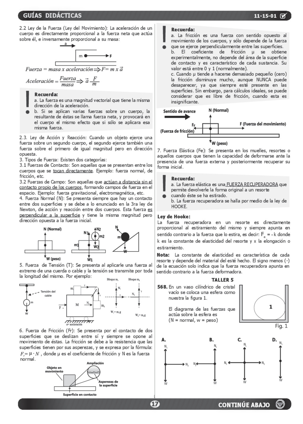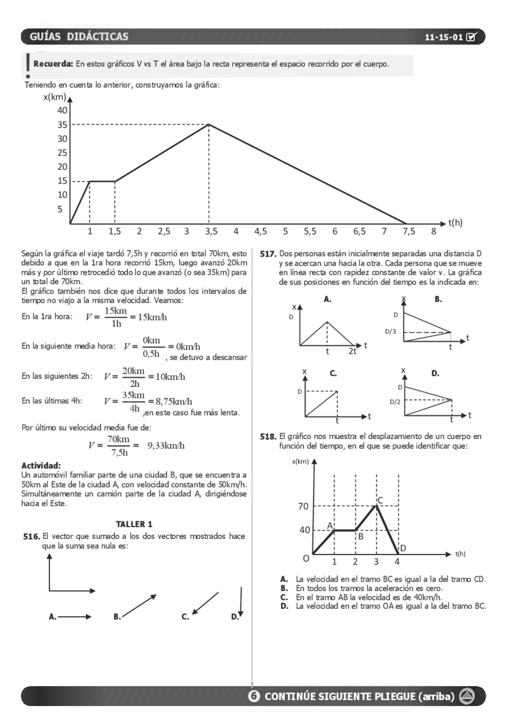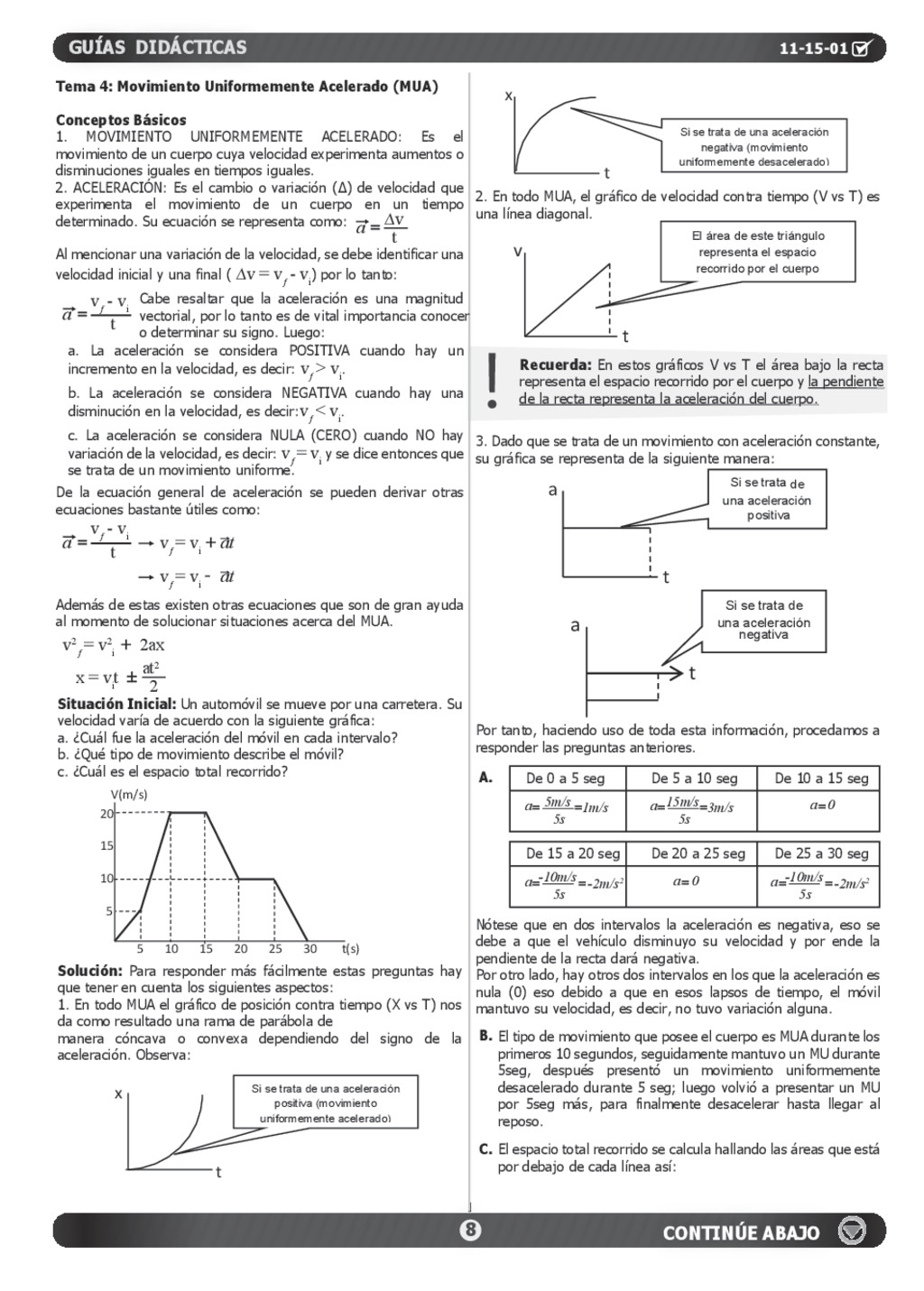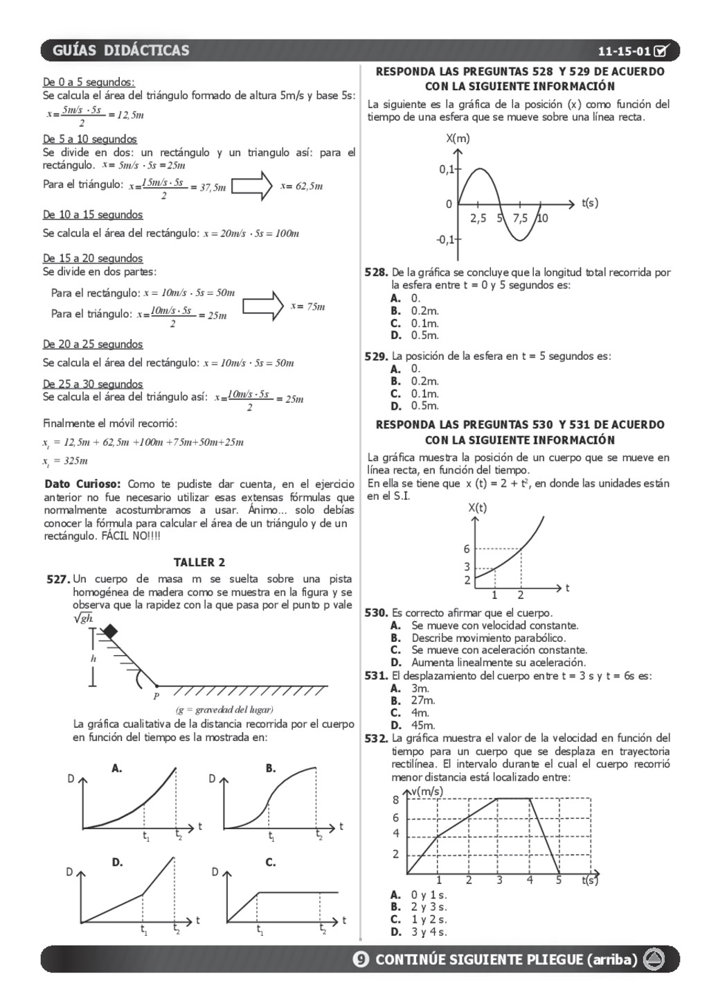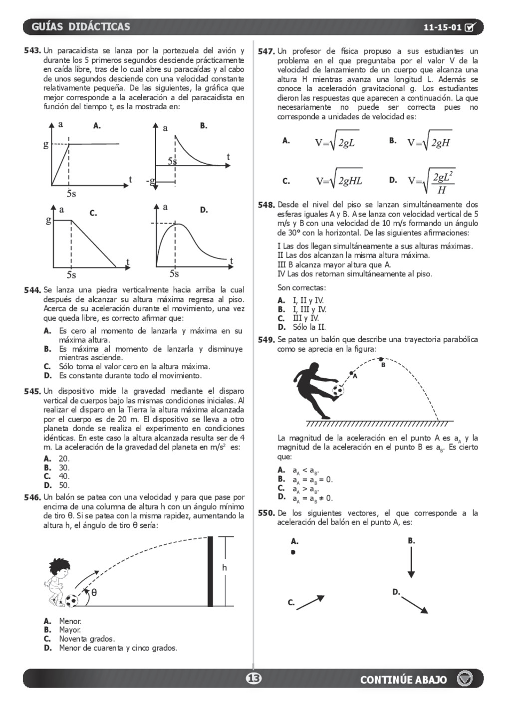 de “g” NO es fijo o constante, ya que cambia levemente de un sitio a otro de la Tierra (debido a la latitud, longitud, altitud, etc.), por lo que se considera siempre su valor medio para ejercicios teóricos. En general, el mayor valor de “g” está en los polos y su valor mínimo en la Línea del Ecuador. Dado que la caída libre y el lanzamiento vertical son movimientos acelerados, las ecuaciones cinemáticas para ellos serán las mismas que se utilizan en un MUA; sólo que a = g (aceleración = gravedad) y x = y (espacio horizontal x, se cambia por altura y). Luego: Recuerda: 1. Cuando un cuerpo se mueve en caída libre su velocidad inicial es NULA ( V i = 0 ), pero aumenta relativamente con el tiempo mientras cae debido a la aceleración gravitacional. 2. En un lanzamiento vertical, la velocidad inicial del cuerpo lanzado hacia arriba es diferente de cero ( V i ≠ 0 ), pero a medida que sube su velocidad disminuye proporcionalmente debido a la acción de la aceleración de la gravedad. Caso contrario sucede si el cuerpo es lanzado verticalmente hacia abajo. V f = V i ± gt V2 f = V2 i ± 2gy y = V i t ± at2 2 Situación Inicial: Un globo de aire caliente controla su altura arrojando sacos de lastre que contienen distintos materiales. Se deja caer un saco de lastre que contiene arena, el cual llega al piso con cierta rapidez, mientras el globo se eleva lentamente y pronto se detiene. En ese instante se deja caer otro saco de lastre que llega al piso con el cuádruple de la rapidez en comparación con la del primero. a. ¿Qué tipo de movimiento poseen los sacos en el momento de la caída? b. ¿Qué altura tenía el globo al soltar el segundo saco con relación a la inicial? Solución: a. Debido a que los sacos se dejan caer desde cierta altura, su movimiento es uniformemente acelerado (caída libre) ya que a medida que baja aumenta su velocidad gracias a la acción de la gravedad. b. Al momento de caer el 2do saco llega con una velocidad de V 2 = 4V 1 . Luego la altura desde la que cayó el saco es: Por lo tanto, el globo estaba a 16 veces la altura inicial al momento de soltar el 2do saco. y 2 = y 2 = 16 y 1 y 2 = 16 = 2g V2 2 2g V2 1 2g (4V 1 )2 Tema 6: Movimientos En El Plano Conceptos Básicos Para el movimiento en dos dimensiones, consideramos el movimiento en dos dimensiones con velocidad constante, el movimiento semiparabólico y el movimiento parabólico. El movimiento en dos dimensiones con velocidad constante, se consideran dos velocidades constantes perpendiculares entre sí que actúan sobre un mismo cuerpo (por ejemplo un deportista que desea atravesar un rio con corriente lanzándose perpendicularmente a la orilla). En este y en los demás movimientos en dos dimensiones se cumple el principio de Galileo: “Cuando un cuerpo es sometido simultáneamente a dos movimientos, cada uno de éstos se cumplen independientemente”. Es el movimiento de una partícula llamada proyectil, que describe como trayectoria una PARÁBOLA en el aire, cuando se la impulsa con una velocidad inicial a un ángulo de elevación. Los tiros parabólicos son el caso más común de movimientos en dos dimensiones, y combina dos tipos de movimientos en uno solo: a. El movimiento HORIZONTAL del tipo parabólico es UNIFORME (MU) ya que avanza espacios iguales en tiempo iguales. b. El movimiento VERTICAL del tiro parabólico es uniformemente acelerado (MUA), debido a la presencia de la aceleración gravitacional, formando una trayectoria de subida y otra de bajada. Dos niños juegan en la playa con una pelota de caucho. El niño A lanza la pelota al niño B, la cual describe la trayectoria mostrada en la figura. En uno de los lanzamientos, cuando la pelota se encuentra en el punto 1, comienza a soplar un viento lateral que ejerce una fuerza hacia la izquierda sobre la pelota. Suponiendo que el aire quieto no ejerce ninguna fricción sobre la pelota, ¿Cómo es el movimiento horizontal de la pelota antes de que haya llegado al punto 1? 1. Movimiento Parabólico PIENSA: Dos niños juegan en la playa con una pelota de caucho. El niño A lanza la pelota al niño B, la cual describe la trayectoria mostrada en la figura. 1. La velocidad inicial V i se le puede indicar en sus componentes vertical (V iy ) y horizontal ( V ix ). 2. La velocidad horizontal (V x ) es constante para todo el recorrido, y en el punto más alto (vértice) toda la velocidad de la partícula equivale a su velocidad horizontal V x = V ix y V x =0 3. El tiempo de subida es igual al tiempo de bajada, debido a que la parábola formada es SIMÉTRICA respecto al eje vertical de su altura máxima (y). 4. Las ecuaciones que lo rigen son: CARACTERÍSTICAS i v ix v ix v iy v ix v y v ix v y v ix v y v 11-15-01