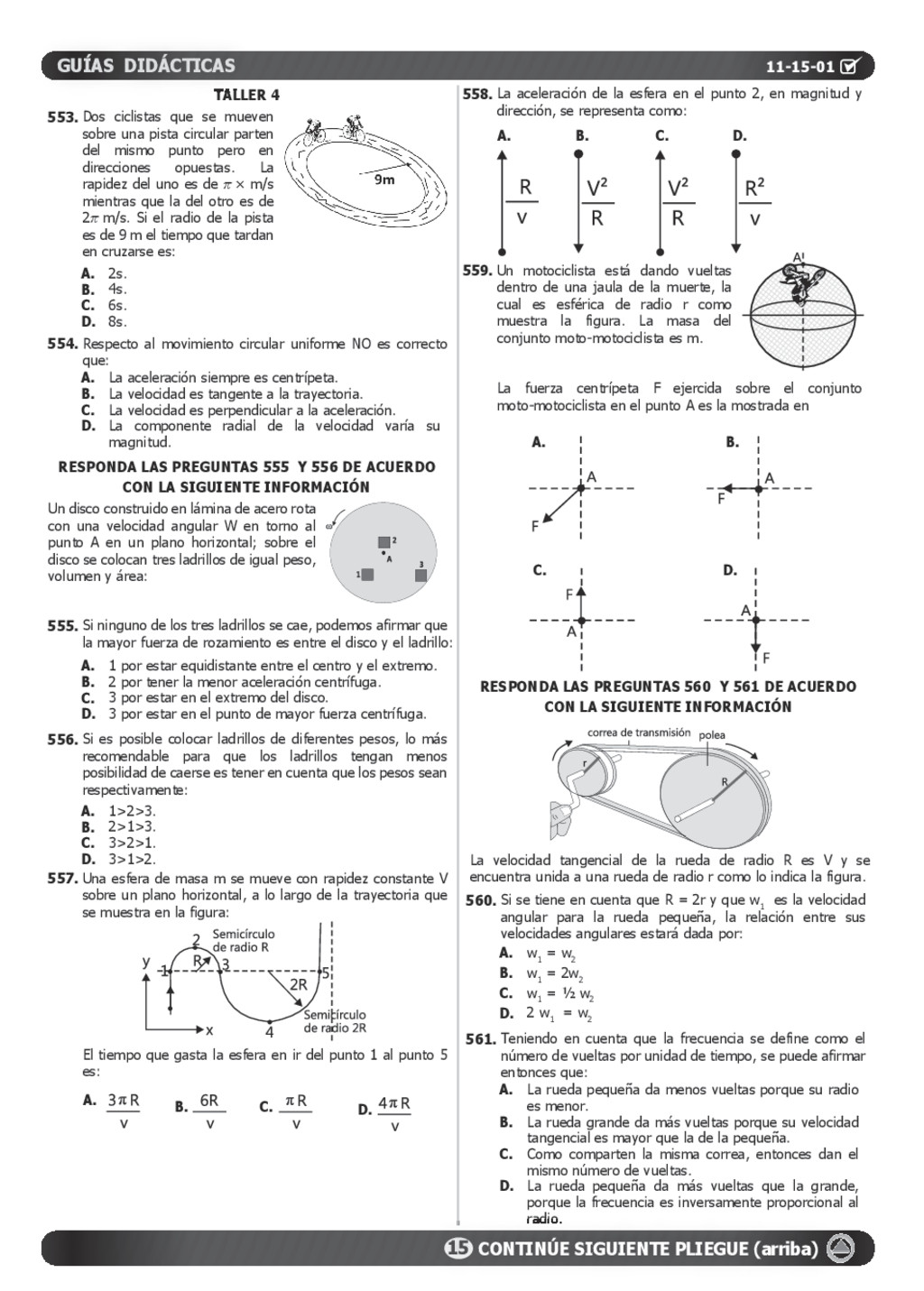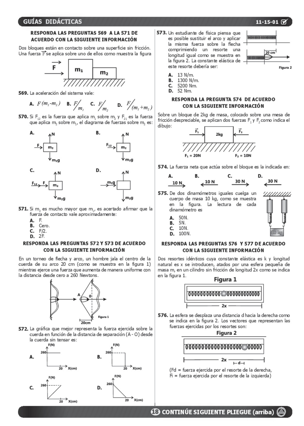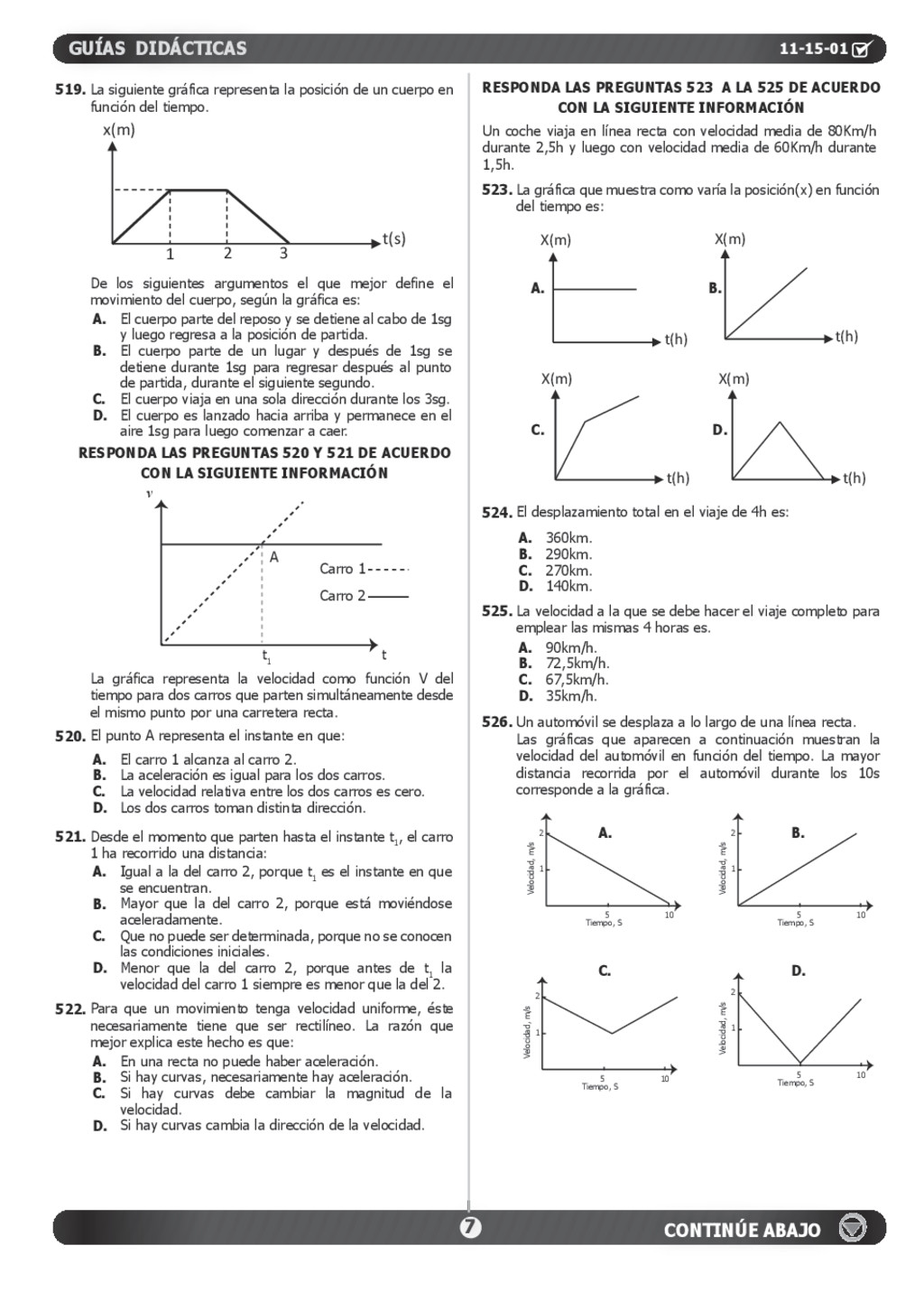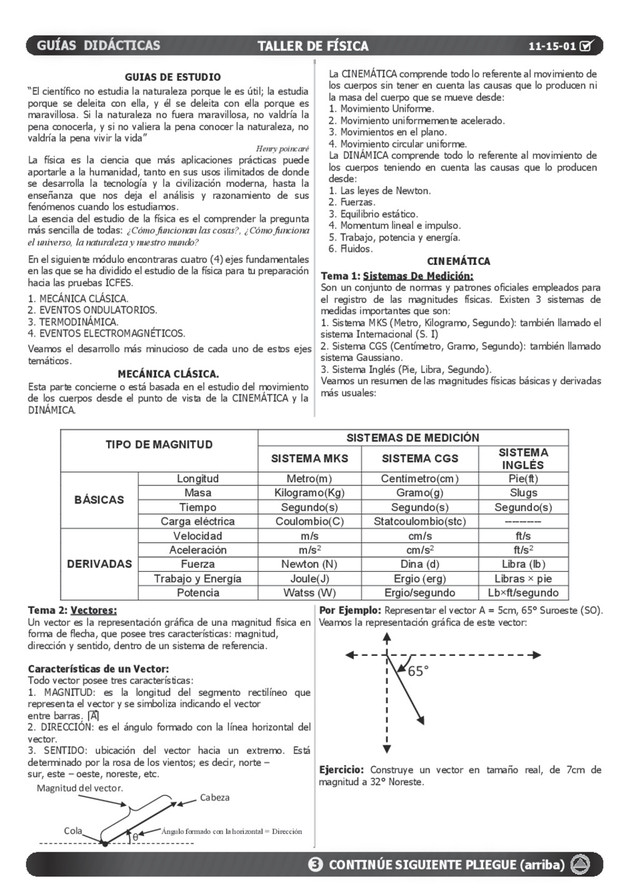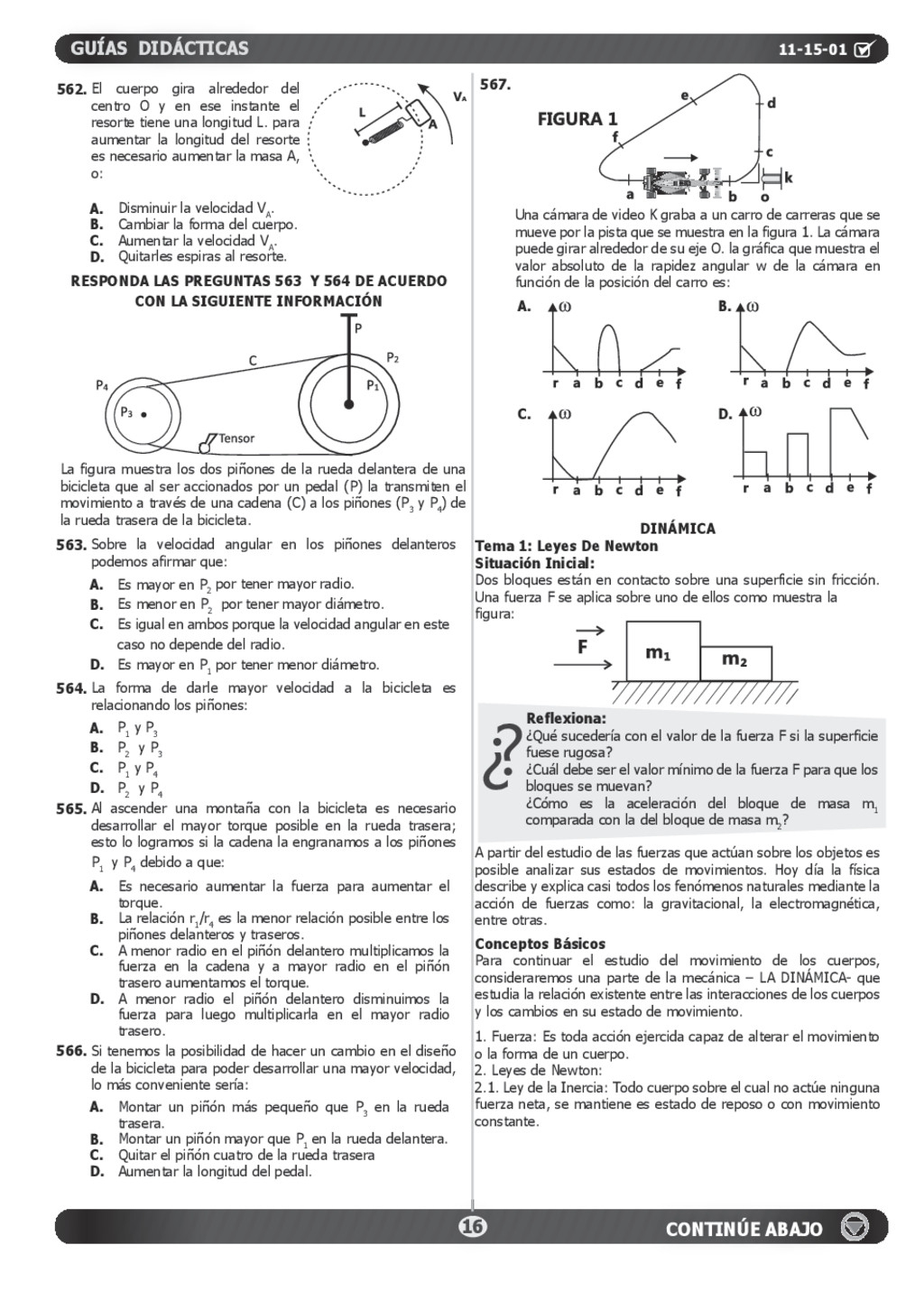 de “g” NO es fijo o constante, ya que cambia levemente de un sitio a otro de la Tierra (debido a la latitud, longitud, altitud, etc.), por lo que se considera siempre su valor medio para ejercicios teóricos. En general, el mayor valor de “g” está en los polos y su valor mínimo en la Línea del Ecuador. Dado que la caída libre y el lanzamiento vertical son movimientos acelerados, las ecuaciones cinemáticas para ellos serán las mismas que se utilizan en un MUA; sólo que a = g (aceleración = gravedad) y x = y (espacio horizontal x, se cambia por altura y). Luego: Recuerda: 1. Cuando un cuerpo se mueve en caída libre su velocidad inicial es NULA ( V i = 0 ), pero aumenta relativamente con el tiempo mientras cae debido a la aceleración gravitacional. 2. En un lanzamiento vertical, la velocidad inicial del cuerpo lanzado hacia arriba es diferente de cero ( V i ≠ 0 ), pero a medida que sube su velocidad disminuye proporcionalmente debido a la acción de la aceleración de la gravedad. Caso contrario sucede si el cuerpo es lanzado verticalmente hacia abajo. V f = V i ± gt V2 f = V2 i ± 2gy y = V i t ± at2 2 Situación Inicial: Un globo de aire caliente controla su altura arrojando sacos de lastre que contienen distintos materiales. Se deja caer un saco de lastre que contiene arena, el cual llega al piso con cierta rapidez, mientras el globo se eleva lentamente y pronto se detiene. En ese instante se deja caer otro saco de lastre que llega al piso con el cuádruple de la rapidez en comparación con la del primero. a. ¿Qué tipo de movimiento poseen los sacos en el momento de la caída? b. ¿Qué altura tenía el globo al soltar el segundo saco con relación a la inicial? Solución: a. Debido a que los sacos se dejan caer desde cierta altura, su movimiento es uniformemente acelerado (caída libre) ya que a medida que baja aumenta su velocidad gracias a la acción de la gravedad. b. Al momento de caer el 2do saco llega con una velocidad de V 2 = 4V 1 . Luego la altura desde la que cayó el saco es: Por lo tanto, el globo estaba a 16 veces la altura inicial al momento de soltar el 2do saco. y 2 = y 2 = 16 y 1 y 2 = 16 = 2g V2 2 2g V2 1 2g (4V 1 )2 Tema 6: Movimientos En El Plano Conceptos Básicos Para el movimiento en dos dimensiones, consideramos el movimiento en dos dimensiones con velocidad constante, el movimiento semiparabólico y el movimiento parabólico. El movimiento en dos dimensiones con velocidad constante, se consideran dos velocidades constantes perpendiculares entre sí que actúan sobre un mismo cuerpo (por ejemplo un deportista que desea atravesar un rio con corriente lanzándose perpendicularmente a la orilla). En este y en los demás movimientos en dos dimensiones se cumple el principio de Galileo: “Cuando un cuerpo es sometido simultáneamente a dos movimientos, cada uno de éstos se cumplen independientemente”. Es el movimiento de una partícula llamada proyectil, que describe como trayectoria una PARÁBOLA en el aire, cuando se la impulsa con una velocidad inicial a un ángulo de elevación. Los tiros parabólicos son el caso más común de movimientos en dos dimensiones, y combina dos tipos de movimientos en uno solo: a. El movimiento HORIZONTAL del tipo parabólico es UNIFORME (MU) ya que avanza espacios iguales en tiempo iguales. b. El movimiento VERTICAL del tiro parabólico es uniformemente acelerado (MUA), debido a la presencia de la aceleración gravitacional, formando una trayectoria de subida y otra de bajada. Dos niños juegan en la playa con una pelota de caucho. El niño A lanza la pelota al niño B, la cual describe la trayectoria mostrada en la figura. En uno de los lanzamientos, cuando la pelota se encuentra en el punto 1, comienza a soplar un viento lateral que ejerce una fuerza hacia la izquierda sobre la pelota. Suponiendo que el aire quieto no ejerce ninguna fricción sobre la pelota, ¿Cómo es el movimiento horizontal de la pelota antes de que haya llegado al punto 1? 1. Movimiento Parabólico PIENSA: Dos niños juegan en la playa con una pelota de caucho. El niño A lanza la pelota al niño B, la cual describe la trayectoria mostrada en la figura. 1. La velocidad inicial V i se le puede indicar en sus componentes vertical (V iy ) y horizontal ( V ix ). 2. La velocidad horizontal (V x ) es constante para todo el recorrido, y en el punto más alto (vértice) toda la velocidad de la partícula equivale a su velocidad horizontal V x = V ix y V x =0 3. El tiempo de subida es igual al tiempo de bajada, debido a que la parábola formada es SIMÉTRICA respecto al eje vertical de su altura máxima (y). 4. Las ecuaciones que lo rigen son: CARACTERÍSTICAS i v ix v ix v iy v ix v y v ix v y v ix v y v 11-15-01