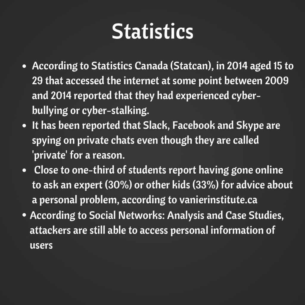 Society Cyberbullying and cyberstalking among Internet users aged 15 to 29 in Canada Insights on Canadian Society Cyberbullying and cyberstalking among Internet users aged 15 to 29 in Canada. Retrieved March 02, 2017, from http://www.statcan.gc.ca/pub/75-006-x/2016001/article/14693-eng.htm The online lives of Canadian youth. (2015, November 4). Retrieved March 2, 2017, from http://vanierinstitute.ca/online-lives-canadian-youth/ http://www.pewinternet.org/2007/04/18/friendship-strangers-and- safety-in-online-social-networks/ Condliffe, J. (2013, May 21). PSA: Your Skype messages Aren’t as private as you think they are. Retrieved March 2, 2017, from http://gizmodo.com/psa- your-skype-messages-arent-as-private-as-you-think-509012101 Miners, Z. (2014, November 24). Slack now lets employers tap workers’ private chats. . Retrieved from http://www.computerworld.com/article/2851719/slack-now-lets- employers-tap-workers-private-chats.html Gündüz-Ogüdücü, S., & Etaner-Uyar, Ş. A. (2014). Social networks: Analysis and case studies.