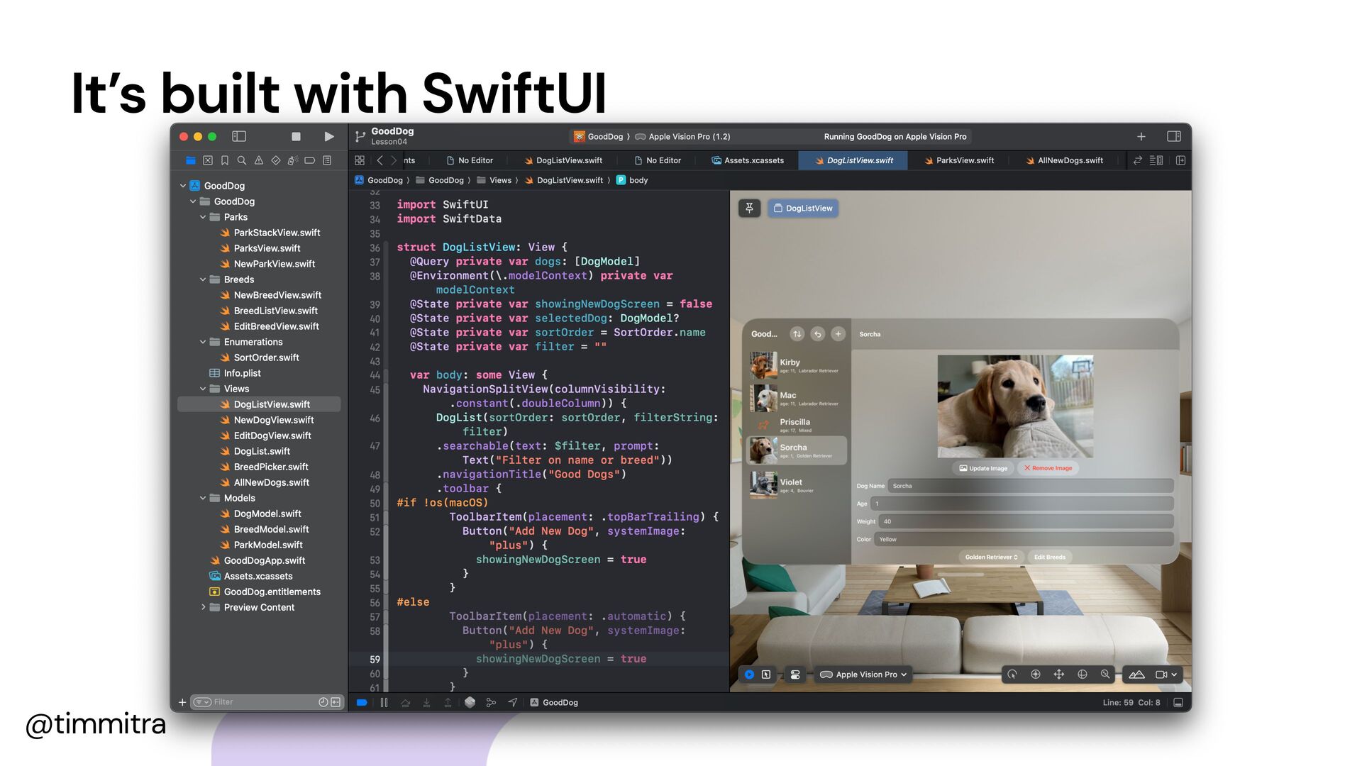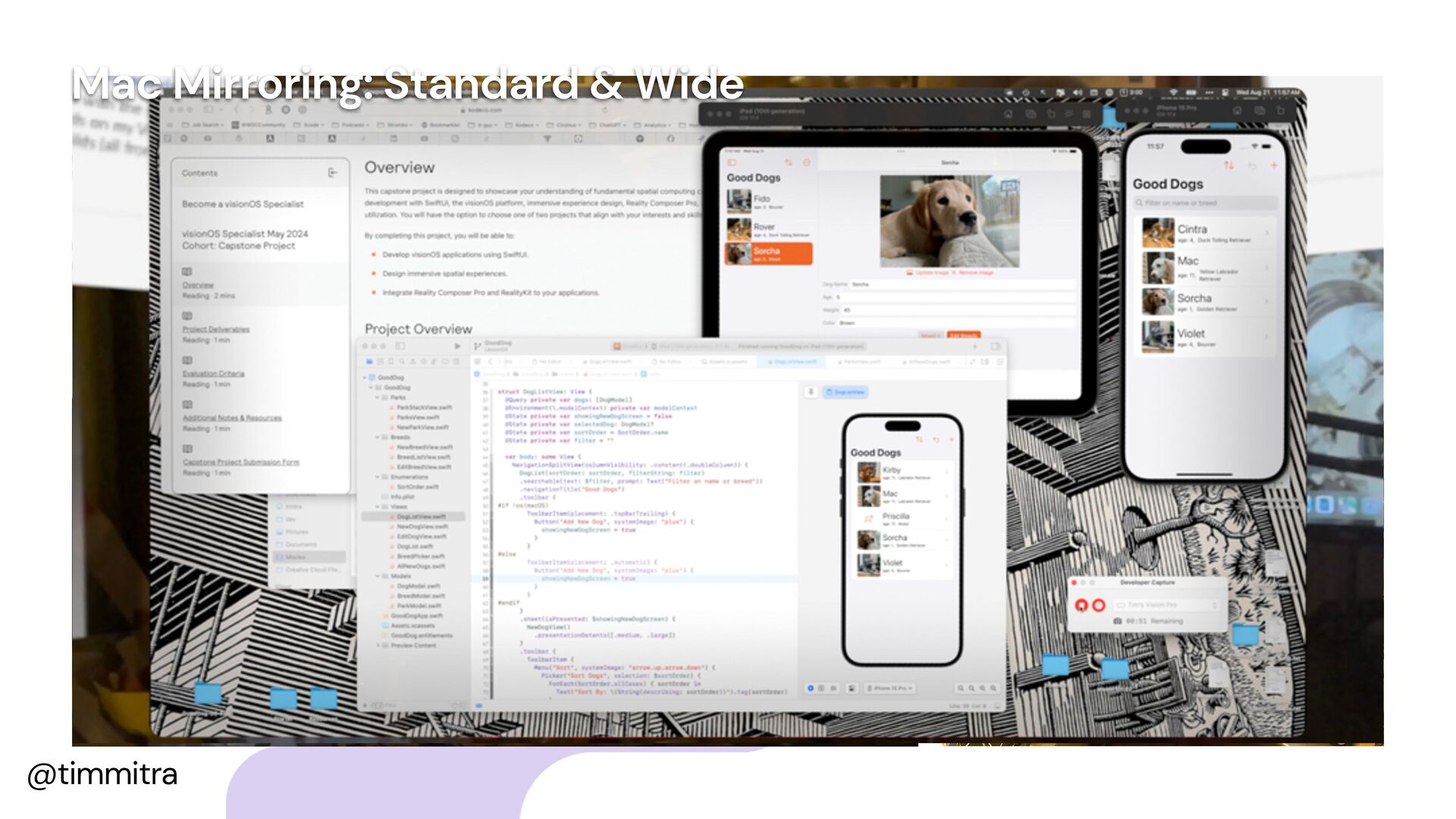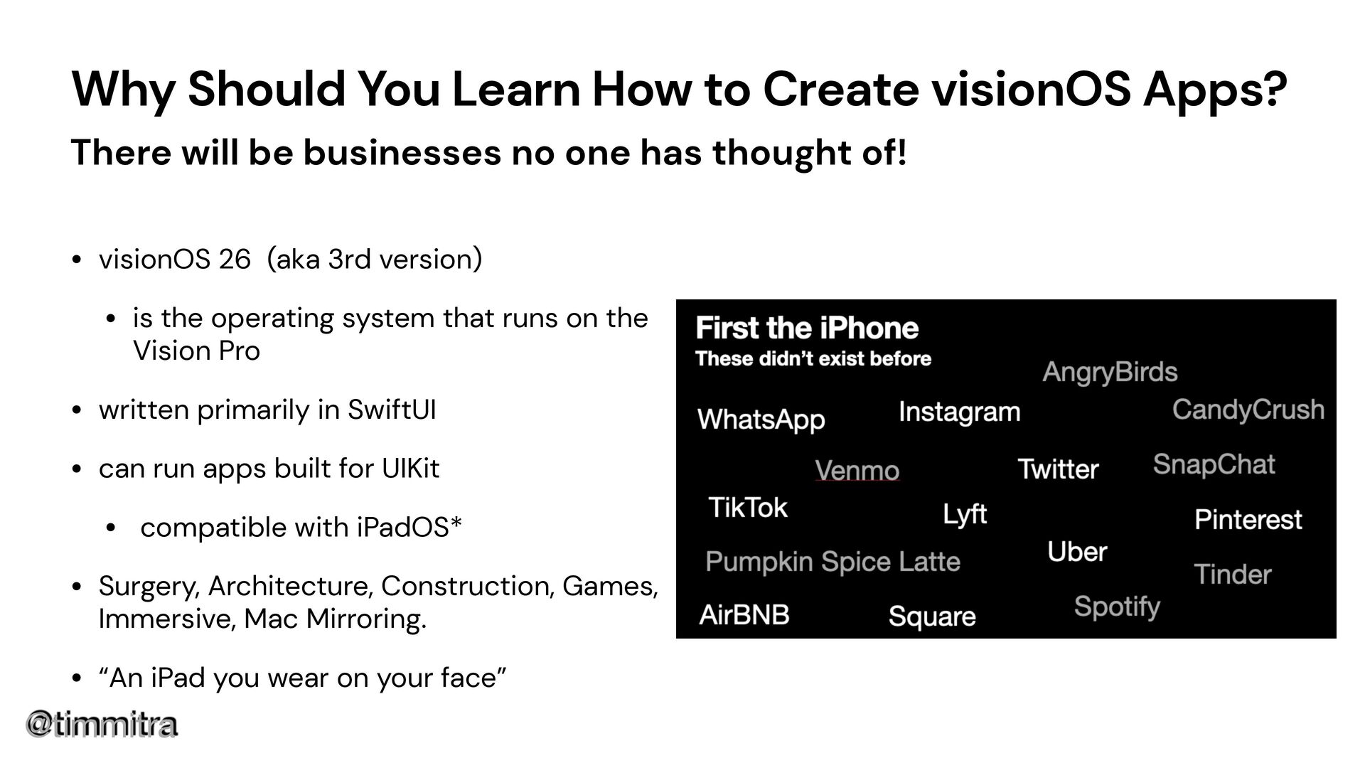 There will be businesses no one has thought of! • visionOS 26 (aka 3rd version) • is the operating system that runs on the Vision Pro • written primarily in SwiftUI • can run apps built for UIKit • compatible with iPadOS* • Surgery, Architecture, Construction, Games, Immersive, Mac Mirroring. • “An iPad you wear on your face”