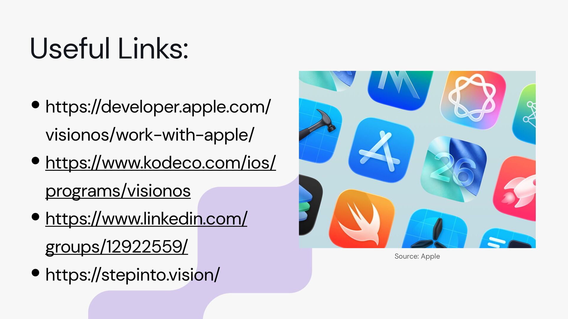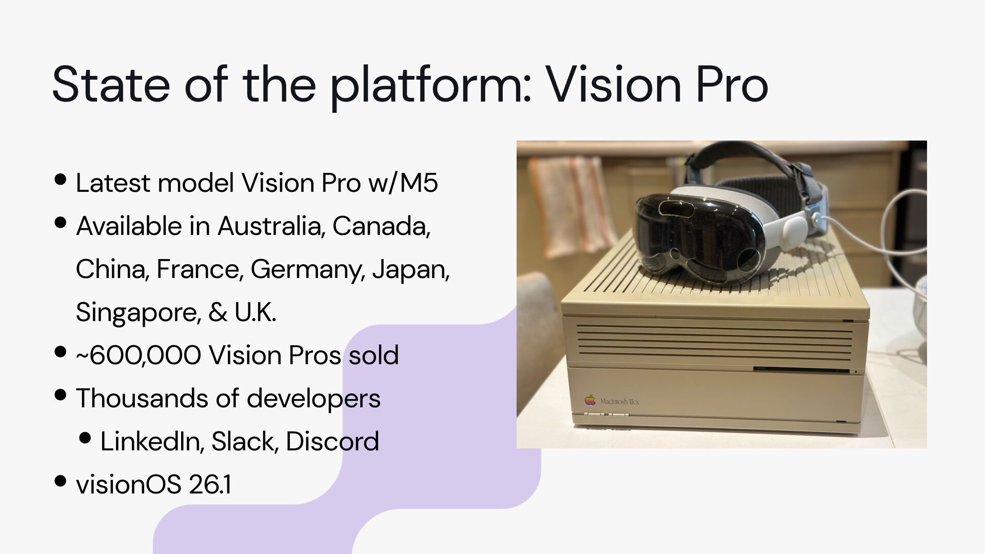 France, Germany, Japan, Singapore, & U.K. •~600,000 Vision Pros sold •Thousands of developers •LinkedIn, Slack, Discord •visionOS 26.1 State of the platform: Vision Pro