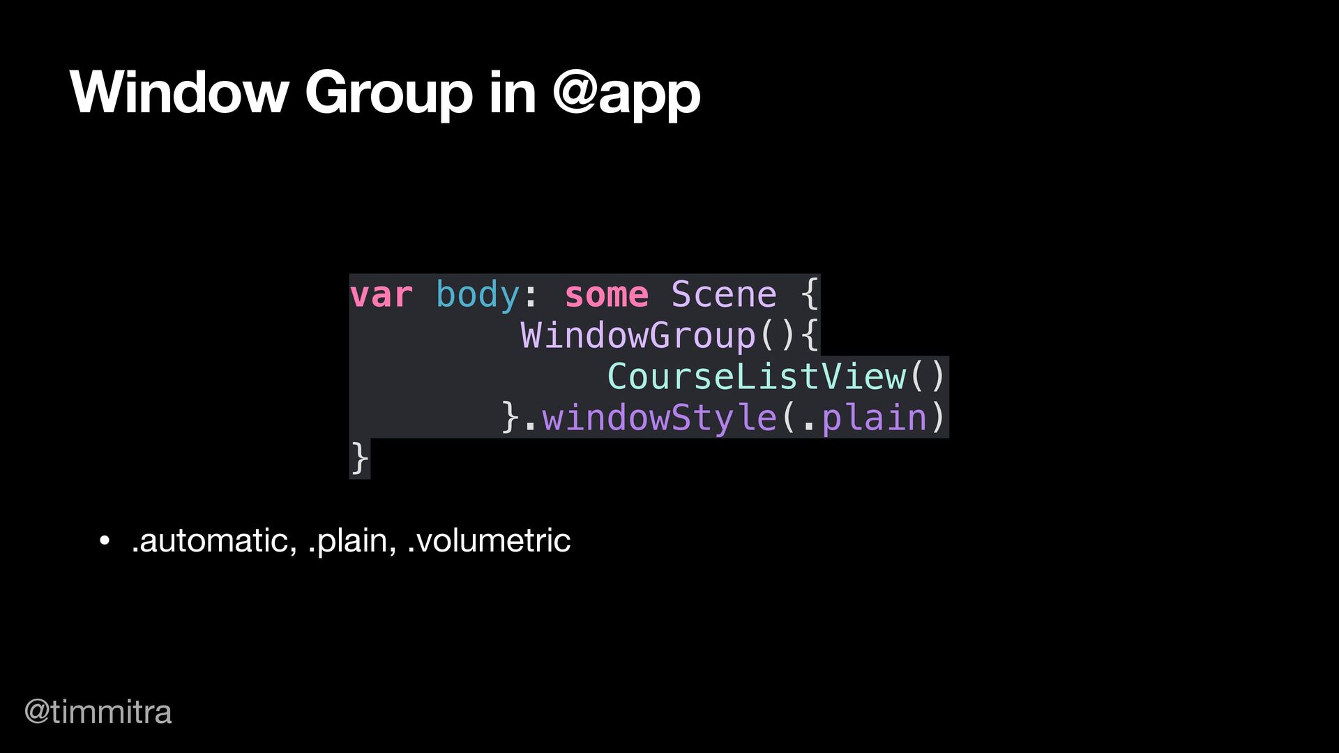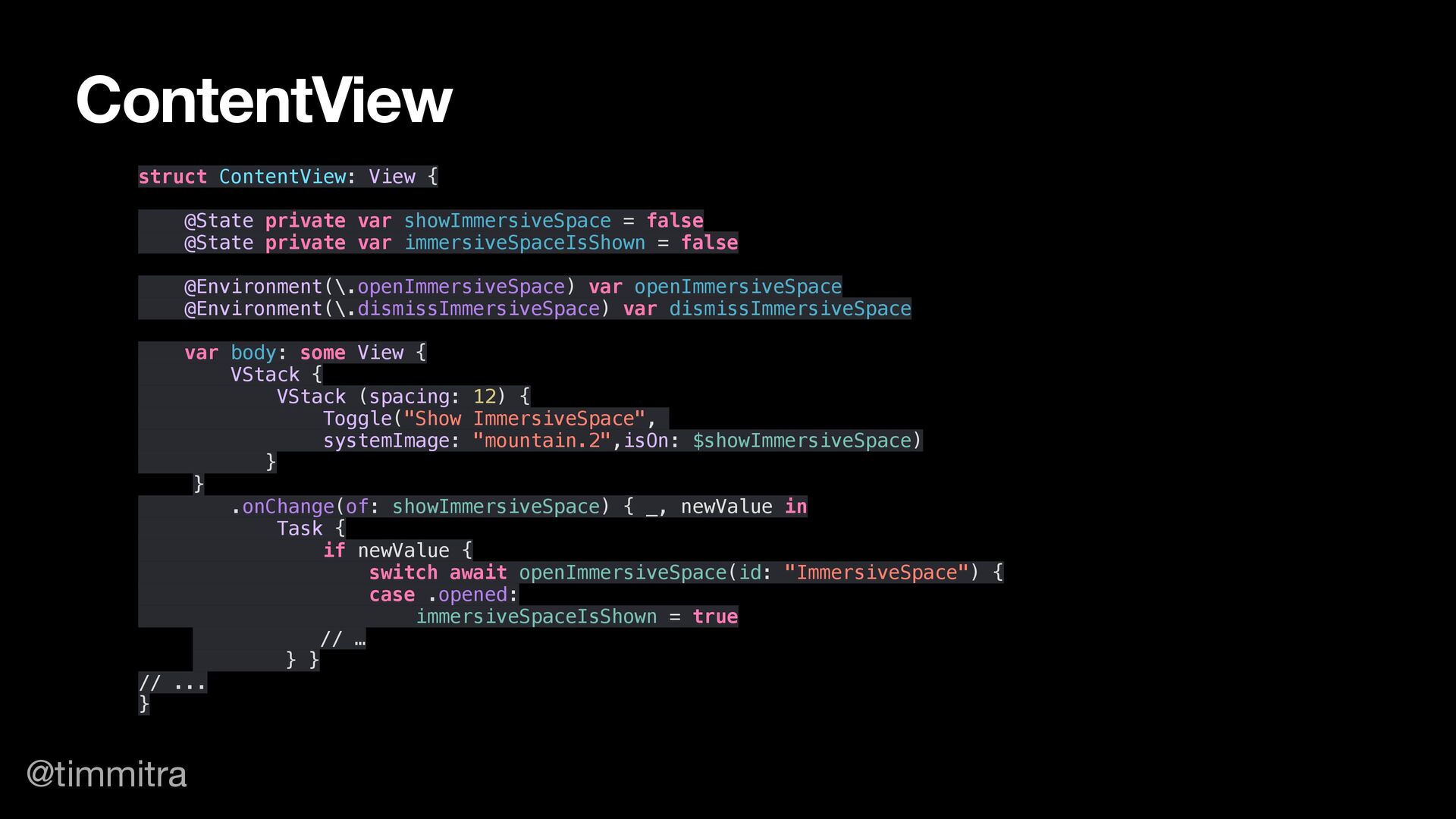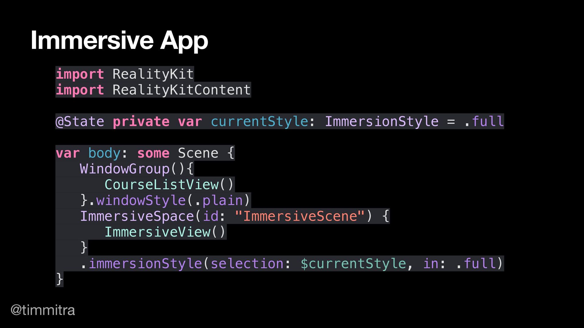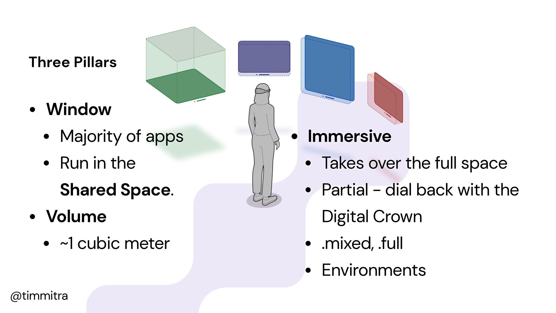• Majority of apps • Run in the Shared Space. • Volume • ~1 cubic meter • Immersive • Takes over the full space • Partial - dial back with the Digital Crown • .mixed, .full • Environments