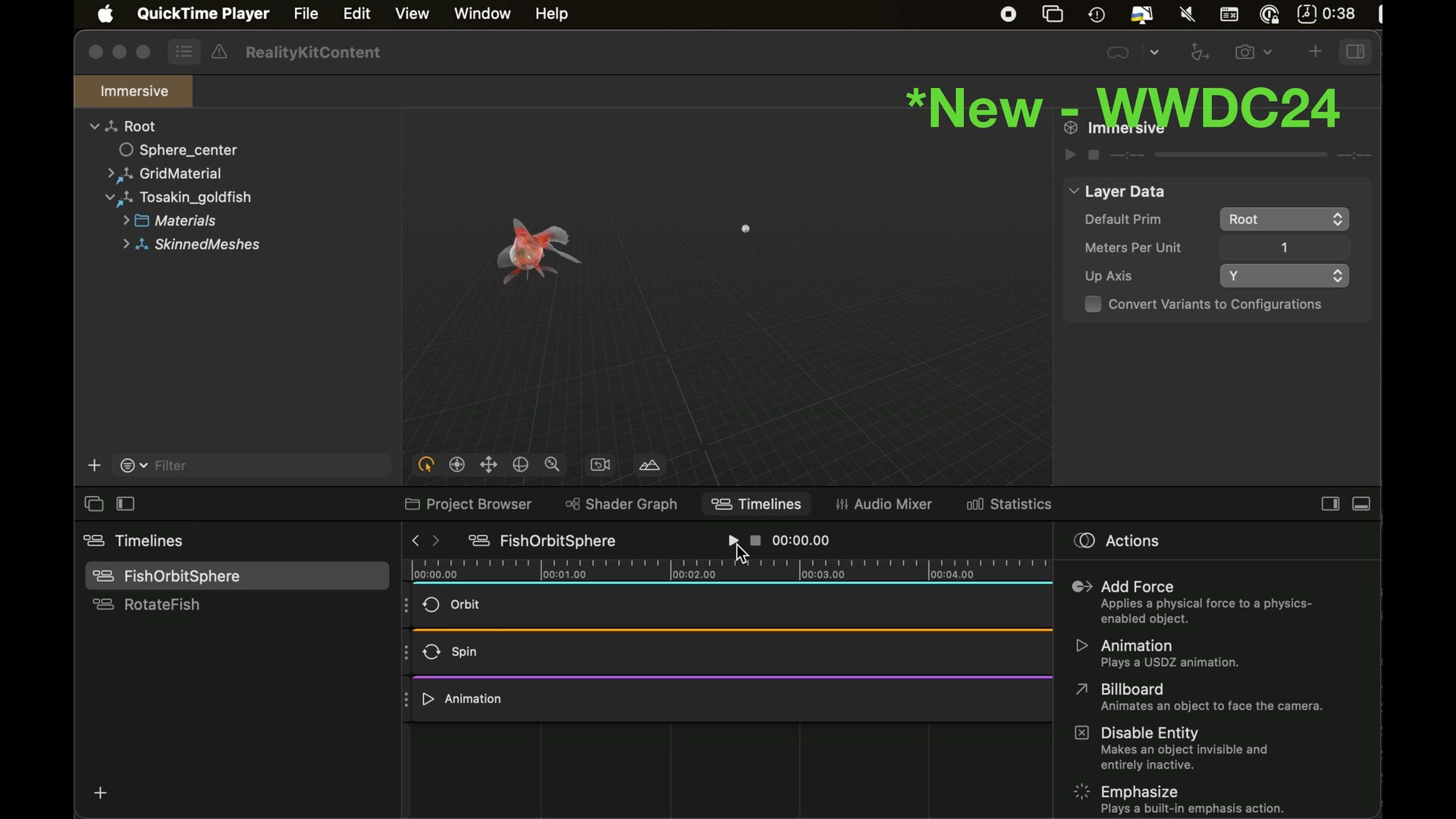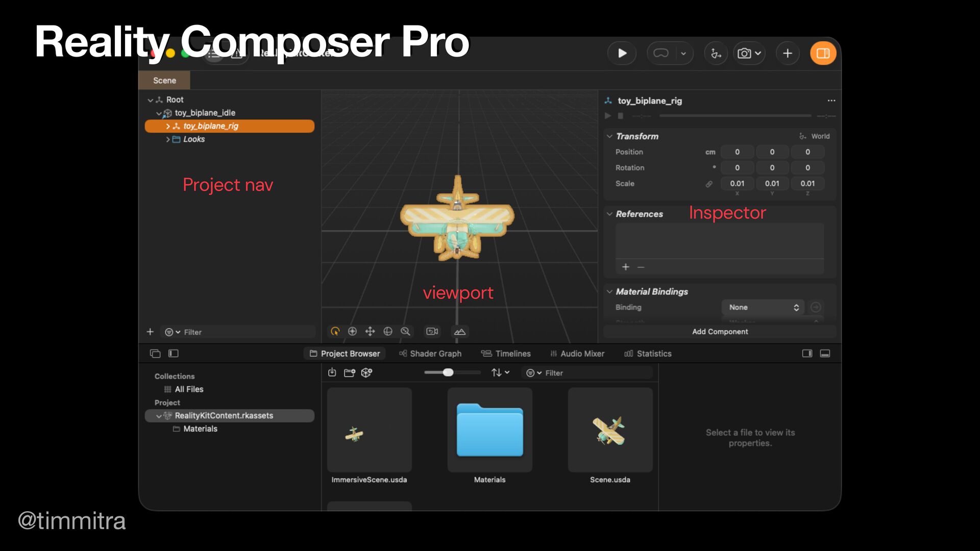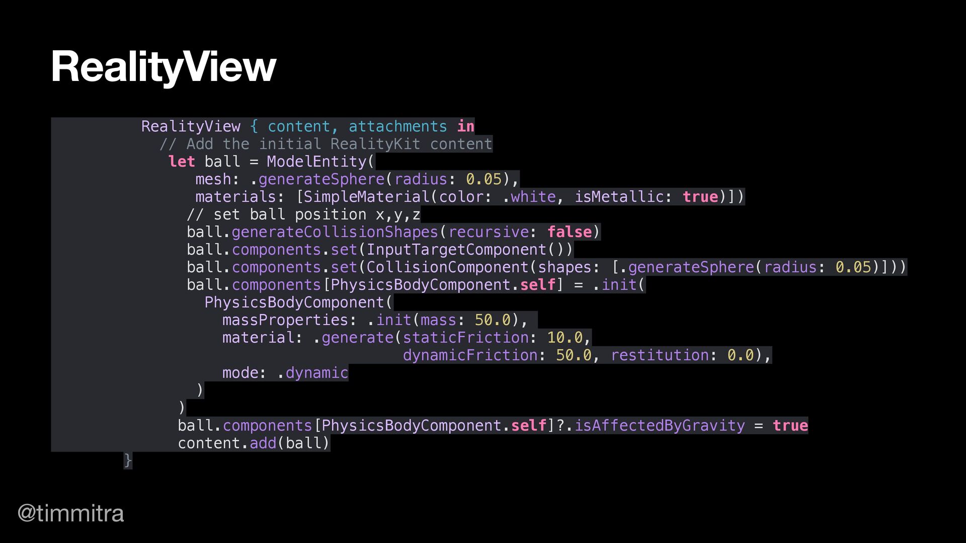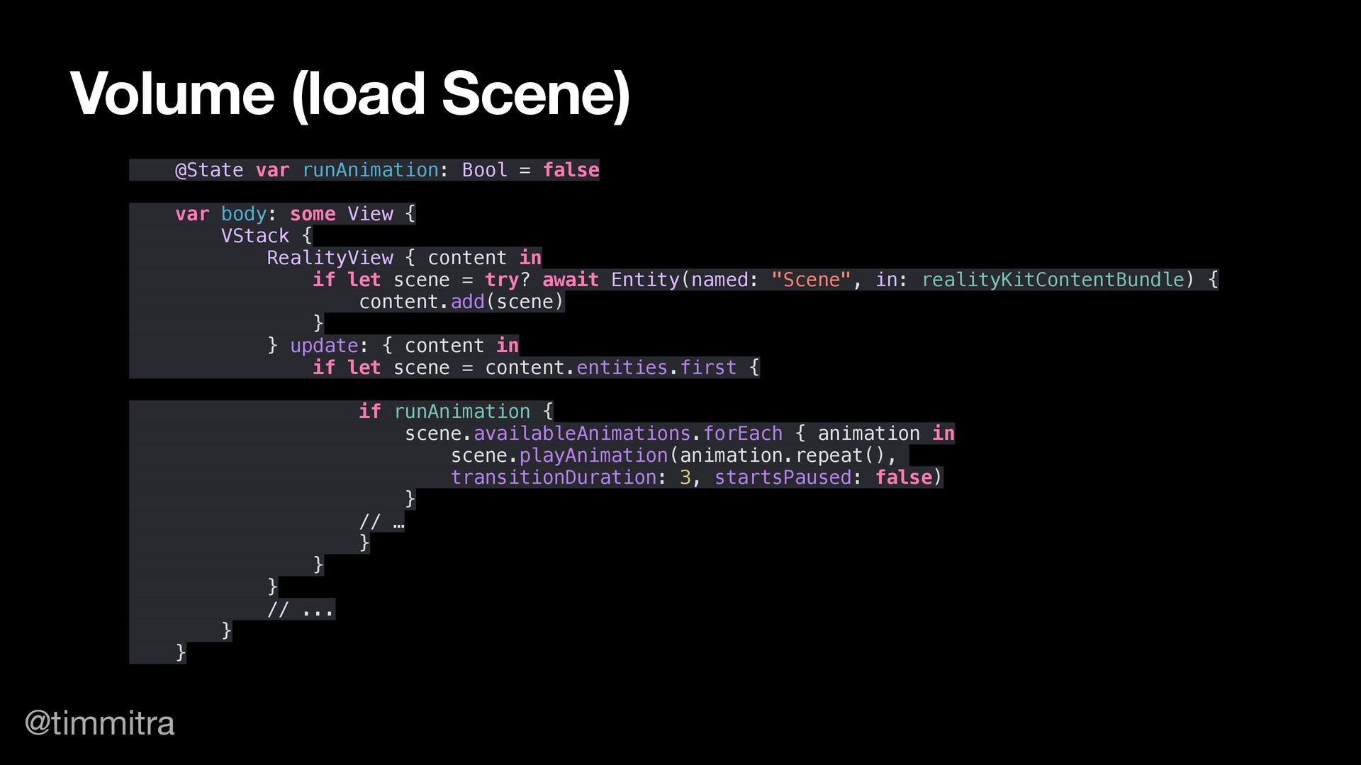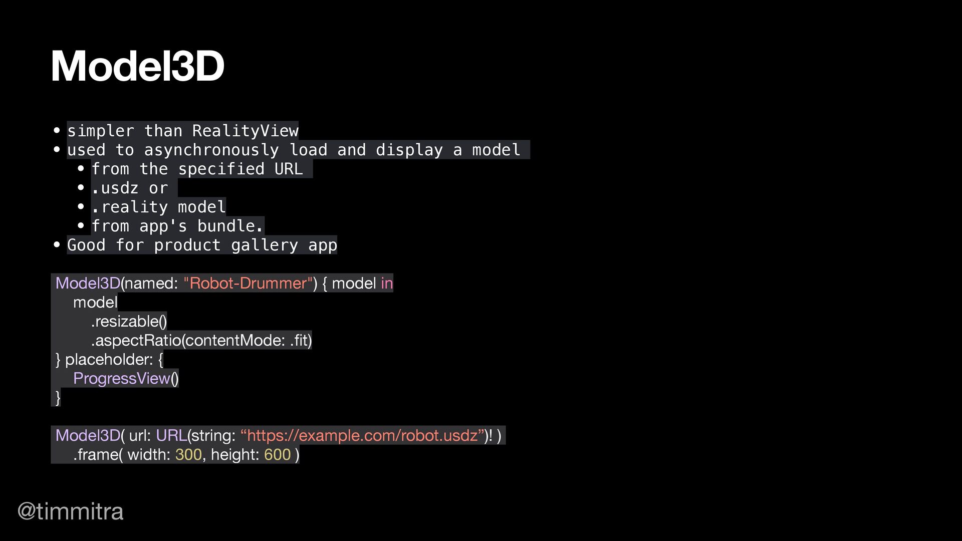 and display a model • from the specified URL • .usdz or • .reality model • from app's bundle. • Good for product gallery app Model3D(named: "Robot-Drummer") { model in model .resizable() .aspectRatio(contentMode: .fit) } placeholder: { ProgressView() } Model3D( url: URL(string: “https://example.com/robot.usdz”)! ) .frame( width: 300, height: 600 ) Model3D