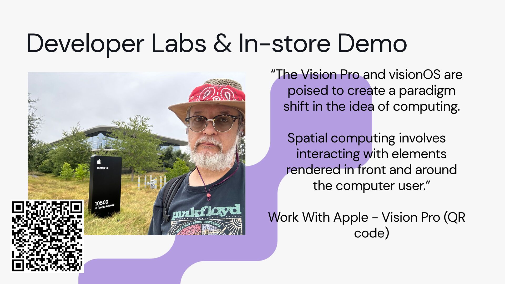 are poised to create a paradigm shift in the idea of computing. Spatial computing involves interacting with elements rendered in front and around the computer user.” Work With Apple - Vision Pro (QR code)