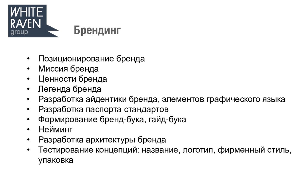 Легенда бренда • Разработка айдентики бренда, элементов графического языка • Разработка паспорта стандартов • Формирование бренд-бука, гайд-бука • Нейминг • Разработка архитектуры бренда • Тестирование концепций: название, логотип, фирменный стиль, упаковка Брендинг