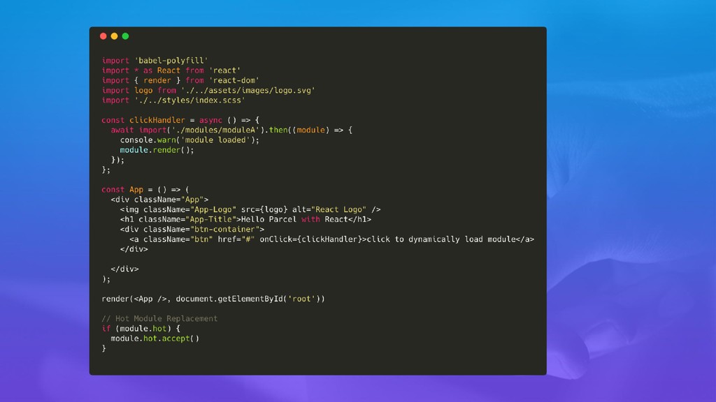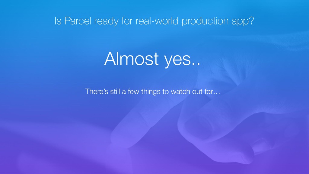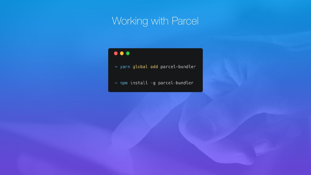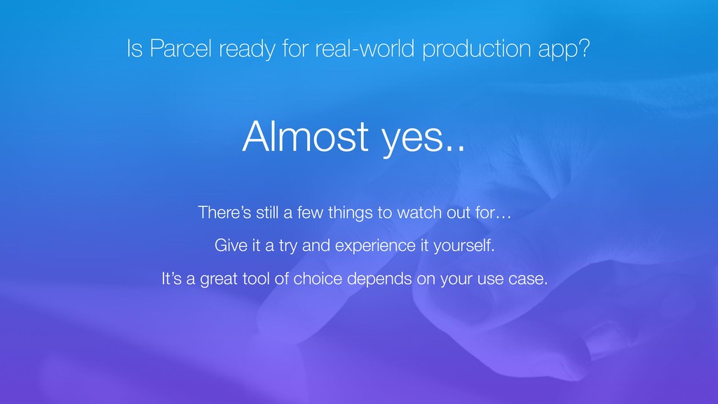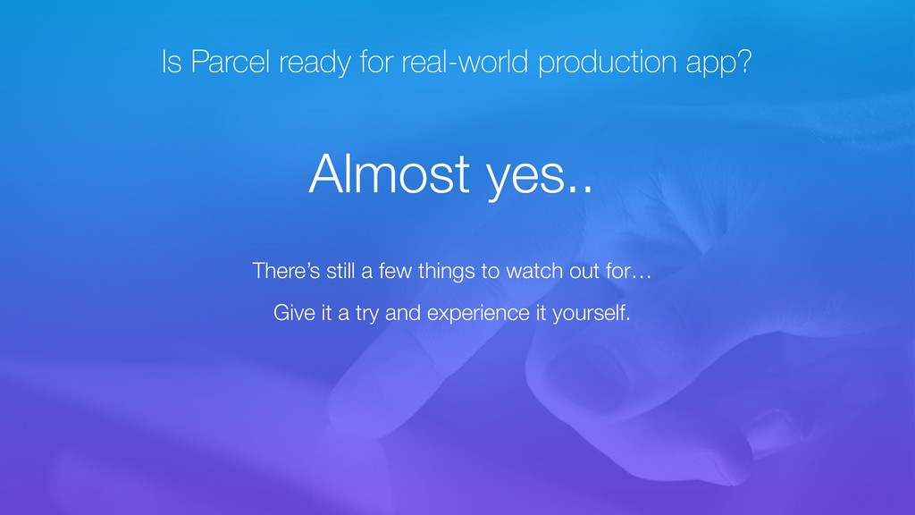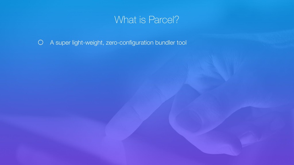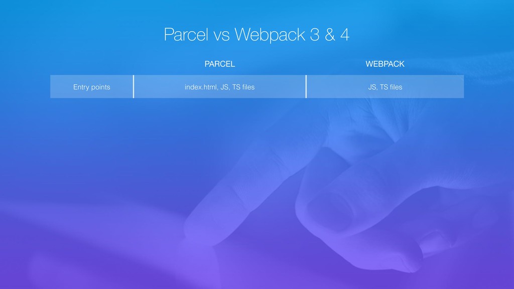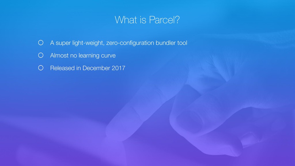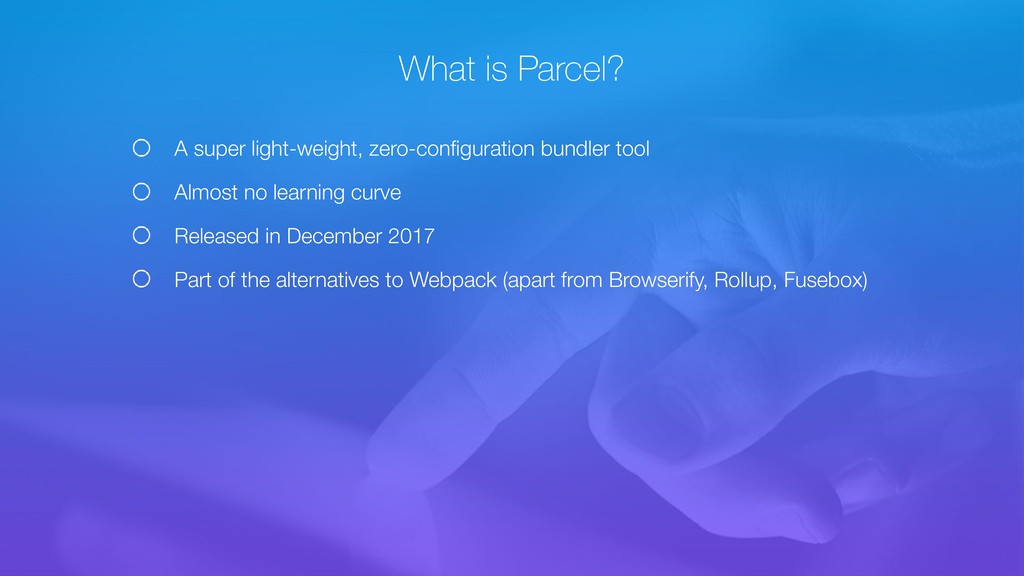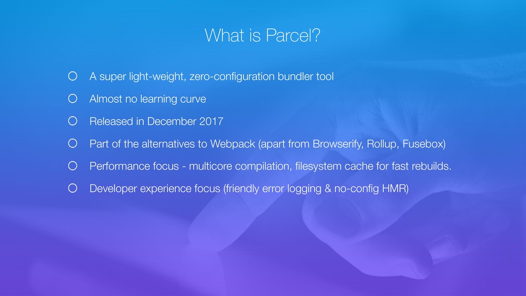 no learning curve Released in December 2017 Part of the alternatives to Webpack (apart from Browserify, Rollup, Fusebox) Performance focus - multicore compilation, filesystem cache for fast rebuilds. Developer experience focus (friendly error logging & no-config HMR) Provides API to customise and write your own bundler