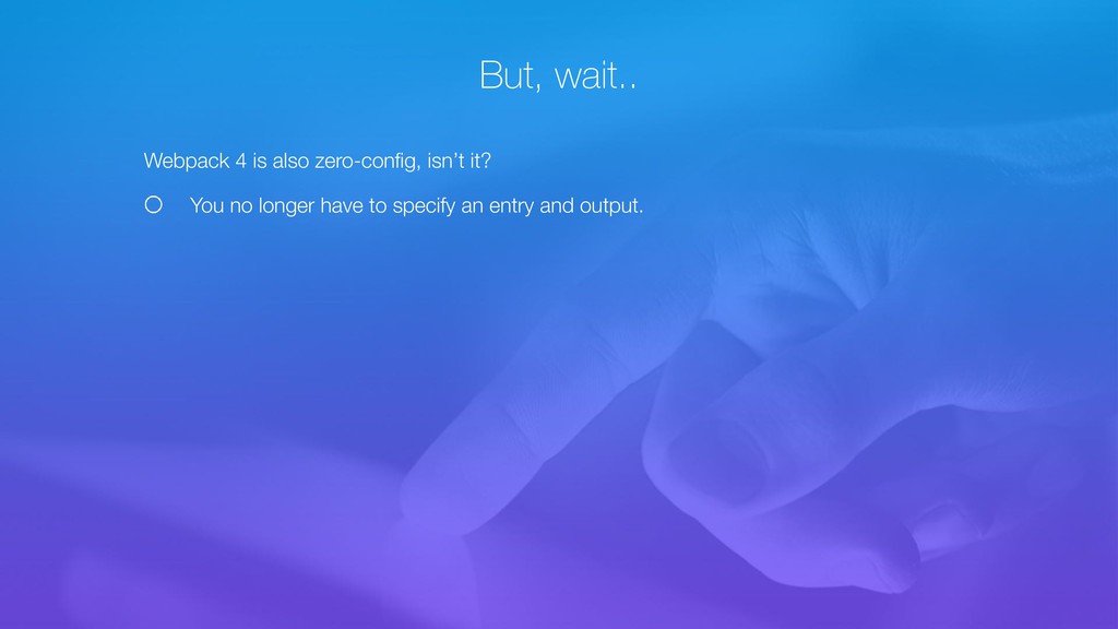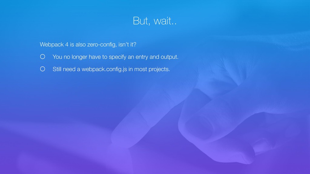 index.html, JS, TS files JS, TS files Outputs Separate files for CSS, JavaScript bundle, images, etc. (Configurable) Inline by default (Configurable) Configuration dot files (package.json, .babelrc, .postcssrc) webpack.config.js + dot files Dev server Support out of the box with HMR webpack-dev-server with HMR Compile time Multi-core. Compile code in parallel. Multi-thread and multi-core in webpack 4 Caching Agressive FS caching mechanism Full-caching hasn’t been implemented yet.