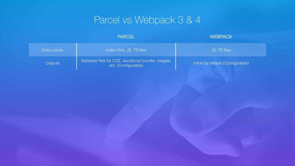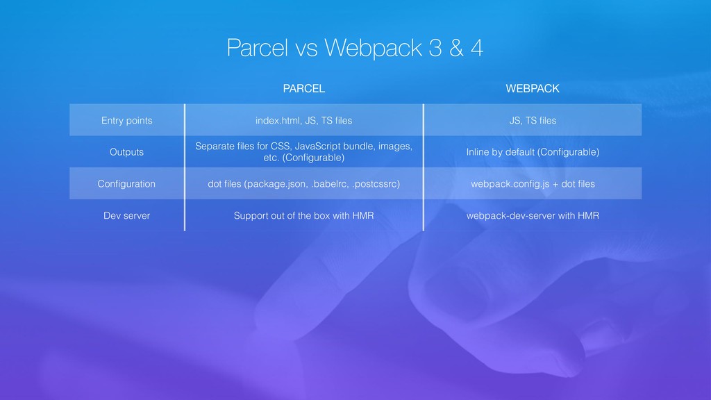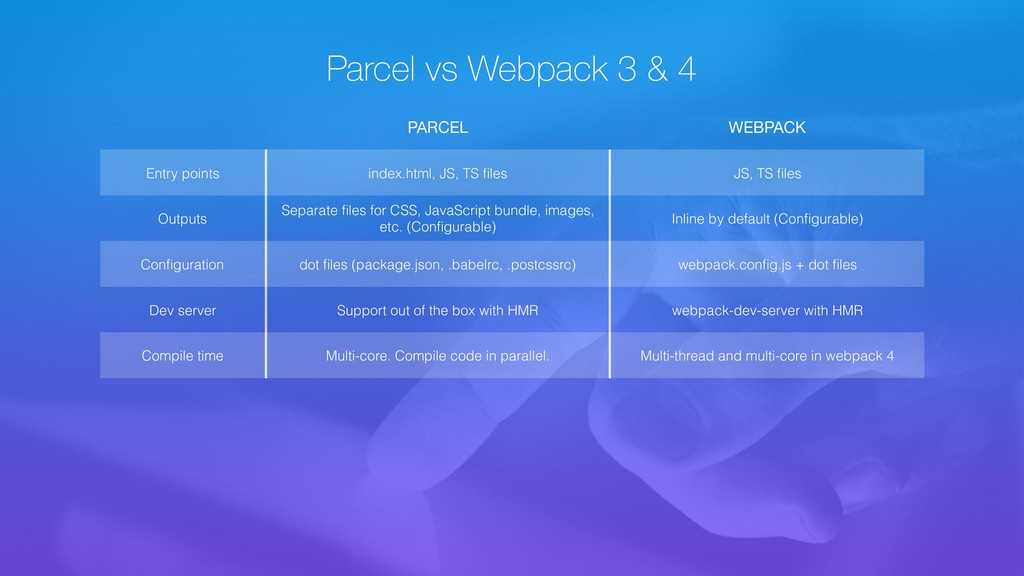 index.html, JS, TS files JS, TS files Outputs Separate files for CSS, JavaScript bundle, images, etc. (Configurable) Inline by default (Configurable) Configuration dot files (package.json, .babelrc, .postcssrc) webpack.config.js + dot files Dev server Support out of the box with HMR webpack-dev-server with HMR Compile time Multi-core. Compile code in parallel. Multi-thread and multi-core in webpack 4
