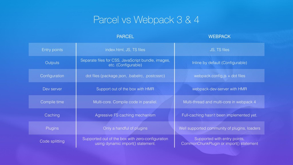 index.html, JS, TS files JS, TS files Outputs Separate files for CSS, JavaScript bundle, images, etc. (Configurable) Inline by default (Configurable) Configuration dot files (package.json, .babelrc, .postcssrc) webpack.config.js + dot files Dev server Support out of the box with HMR webpack-dev-server with HMR Compile time Multi-core. Compile code in parallel. Multi-thread and multi-core in webpack 4 Caching Agressive FS caching mechanism Full-caching hasn’t been implemented yet. Plugins Only a handful of plugins Well supported community of plugins, loaders Code splitting Supported out of the box with zero-configuration using dynamic import() statement. Supported with entry points, CommonChunkPlugin or import() statement