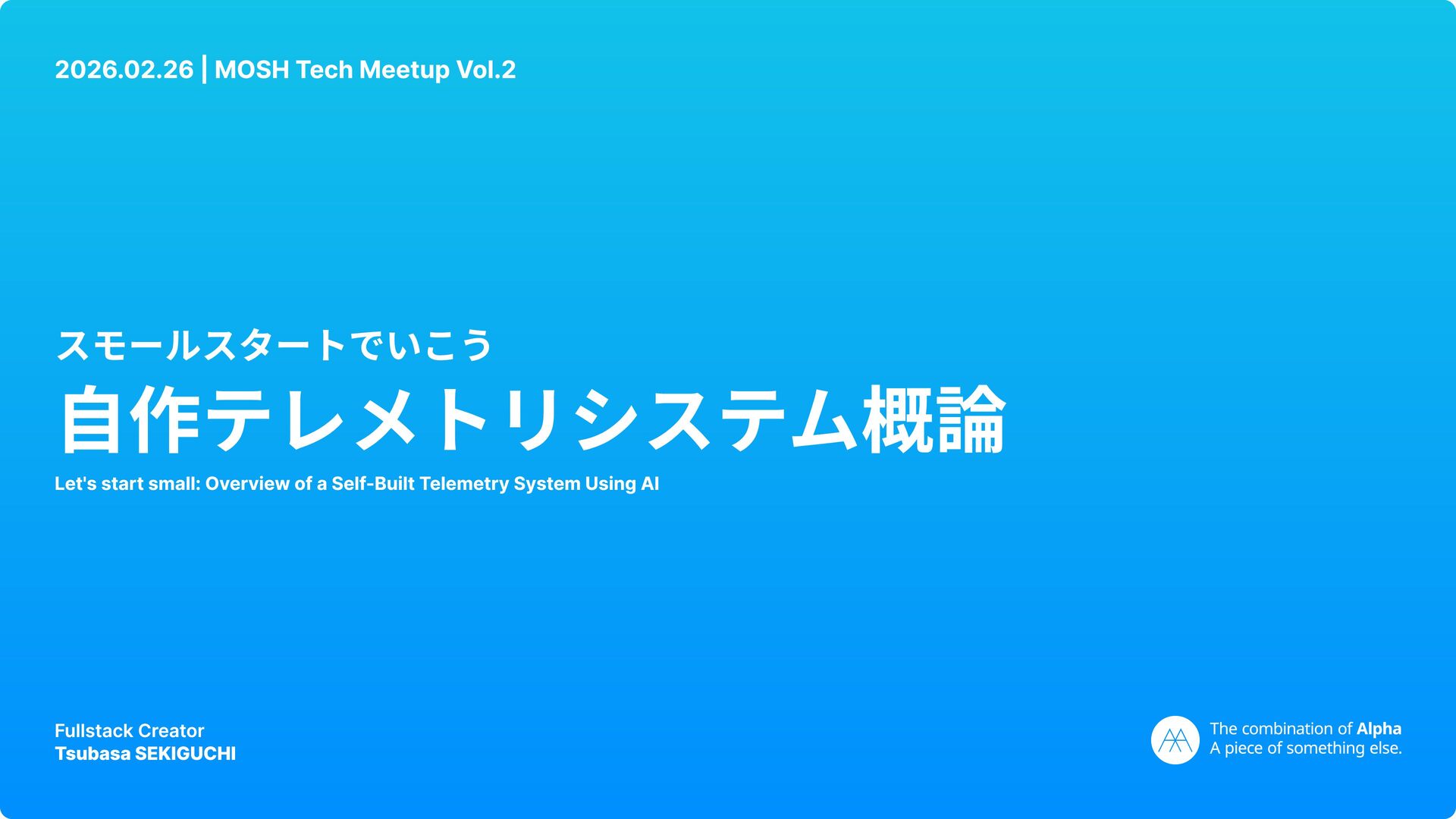 r e a t o r T s u b a s a S E K I G U C H I 202 6 .02. 26 | MO SH T ech Me etu p Vol.2 ¹ â ü ë ¹ ¿ ü È g D S F ê \ Æ ì á È ê · ¹ Æ à ‡ Ö Le t's start sm all: O ver vie w o f a S el f-B uilt Te lemet ry Sys tem U sing AI