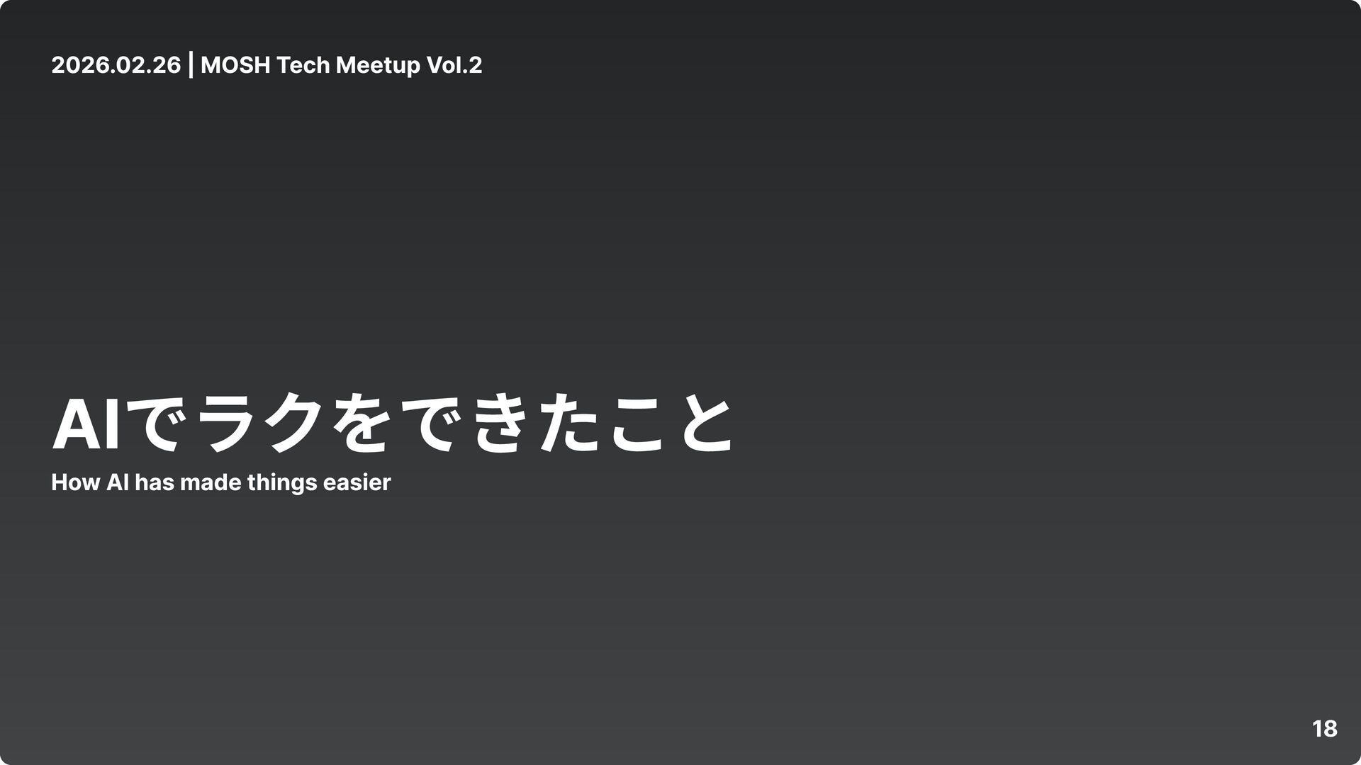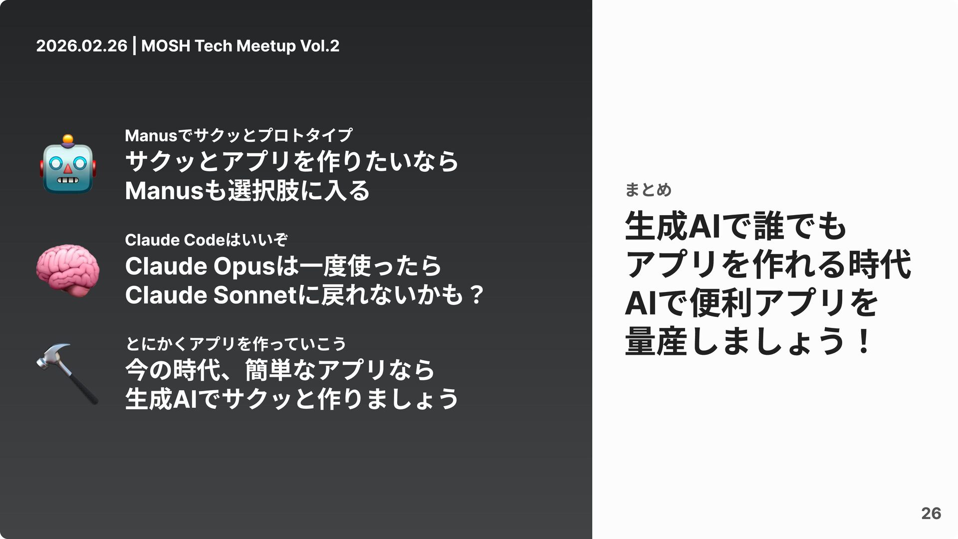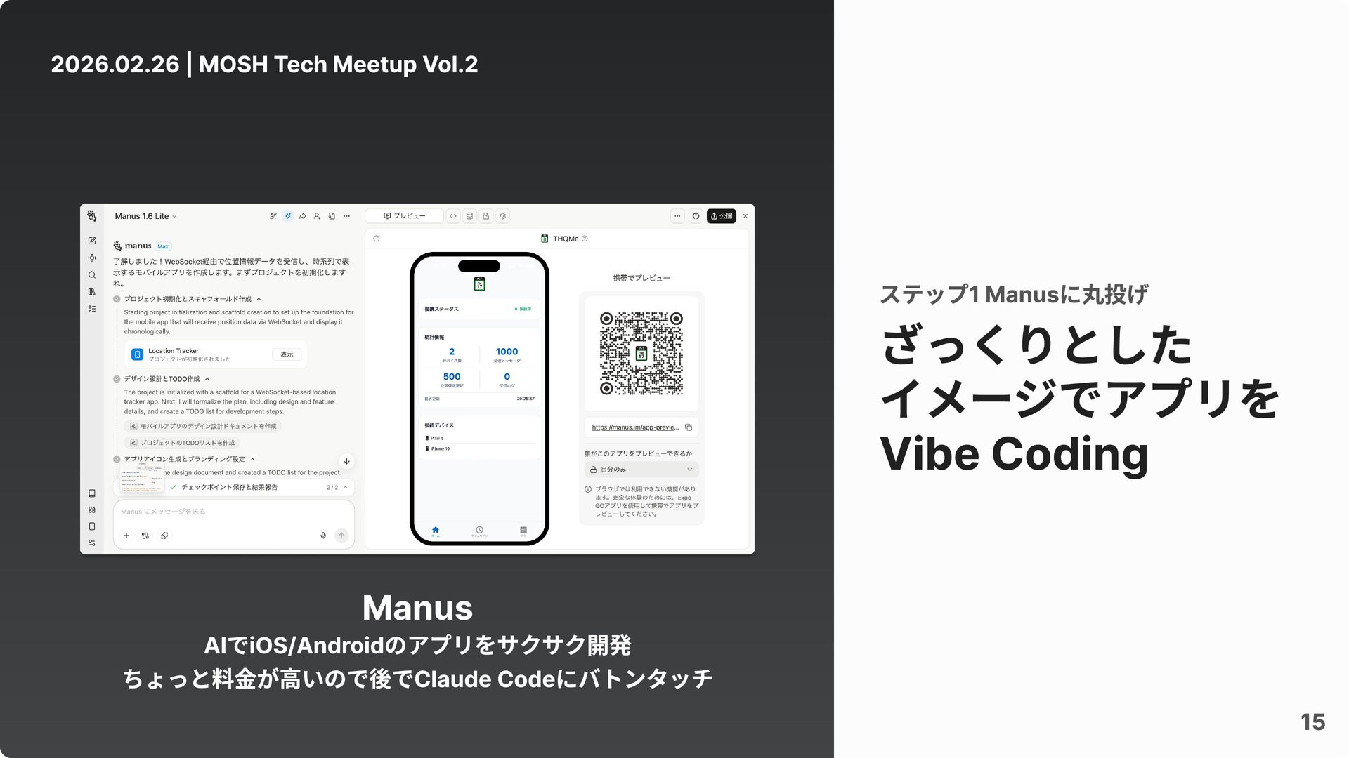 S / A n d r o i d n ¢ × ê ™ µ ¯ µ ¯ ‰ z a ⁄ c h Ž Ñ L Ø D n g „ g C l a u d e C o d e k Ð È ó ¿ Ã Á 202 6 .02. 26 | MO SH T ech Me etu p Vol.2 15 V c O − h W _ ¤ á ü ¸ g ¢ × ê ™ V i b e C o d i n g ¹Æ Ã×1 M anu sk8 ŁR