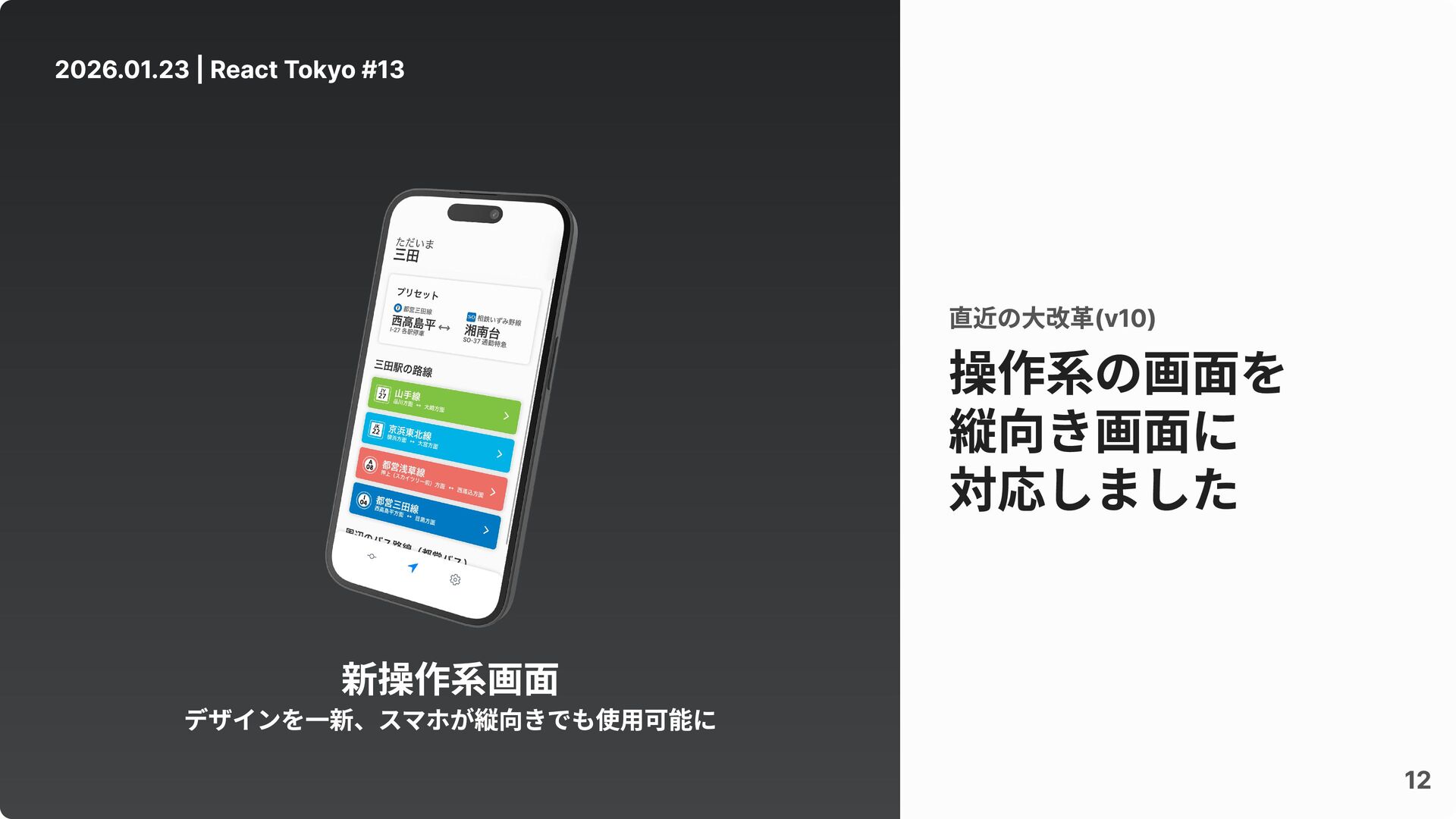 12 操作系の画面を 縦向き画面に 対応しました 直近の大改革(v10) 2026.01.23 | React Tokyo #13