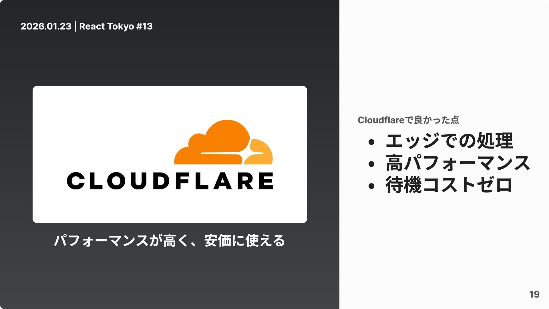 2026.01.23 | React Tokyo #13 19 エッジでの処理 高パフォーマンス 待機コストゼロ Cloudflareで良かった点
