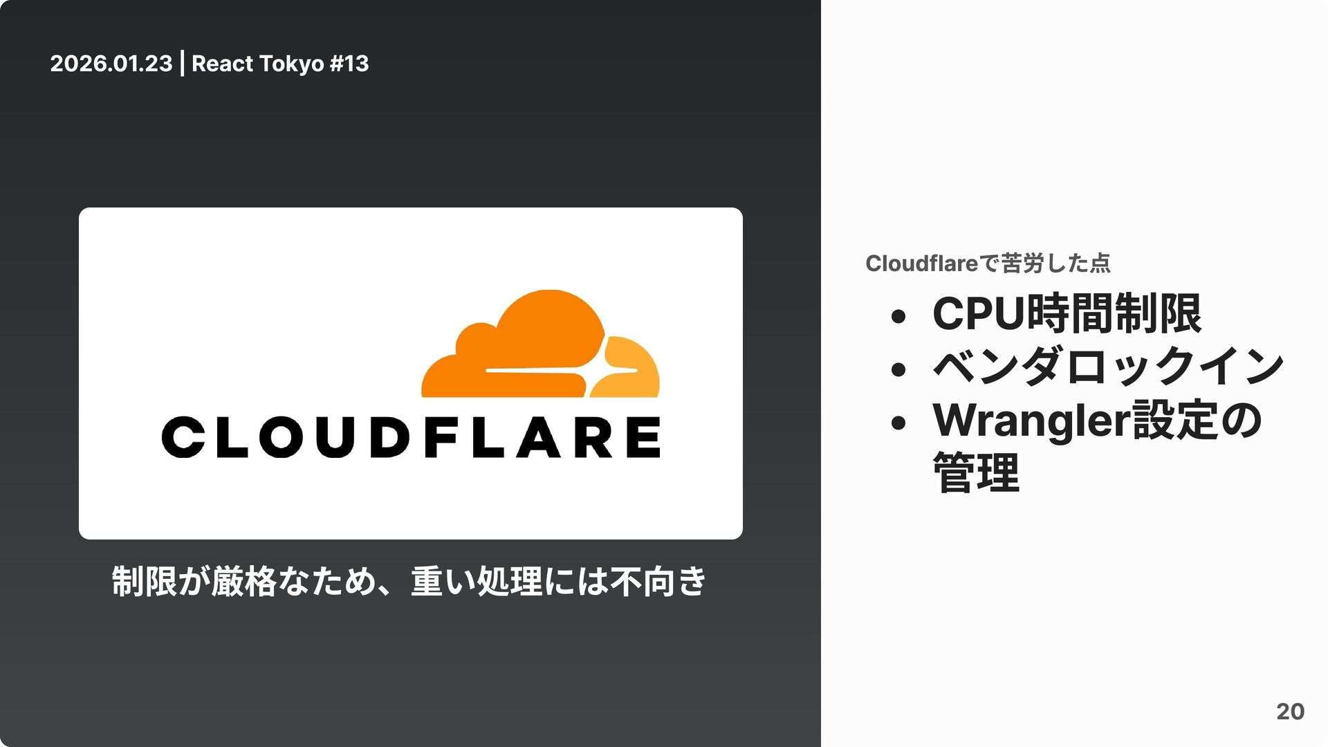 2026.01.23 | React Tokyo #13 20 CPU時間制限 ベンダロックイン Wrangler設定の 管理