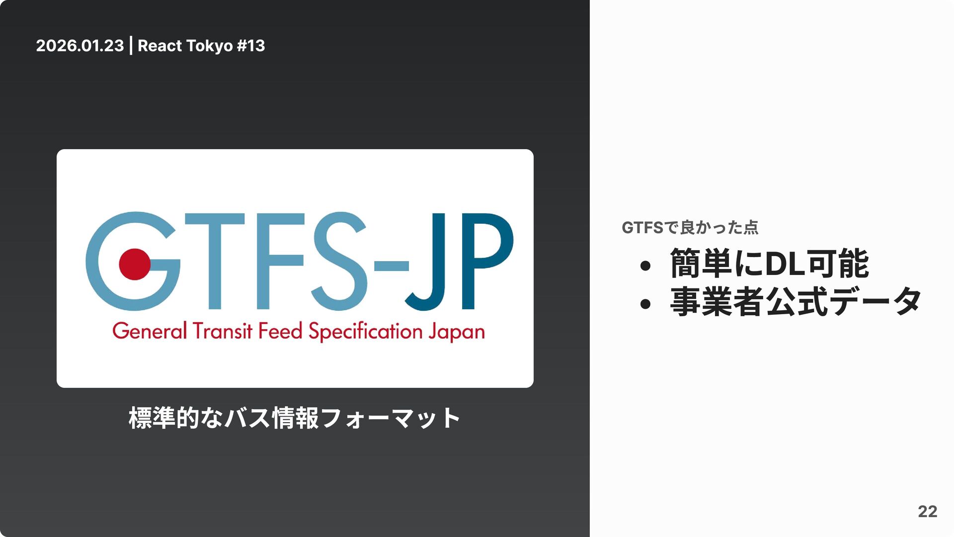 2026.01.23 | React Tokyo #13 22 簡単にDL可能 事業者公式データ GTFSで良かった点 標準的なバス情報フォーマット